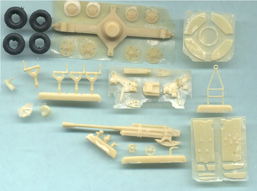 There are about 45 cast resin parts on either pour blocks or pancakes for the thin parts like the gun shield (right side of the photo). You may wish to drill out the muzzle for greater realism. The four tires are molded in black soft rubber with flash and poor detail. No ammunition is included.