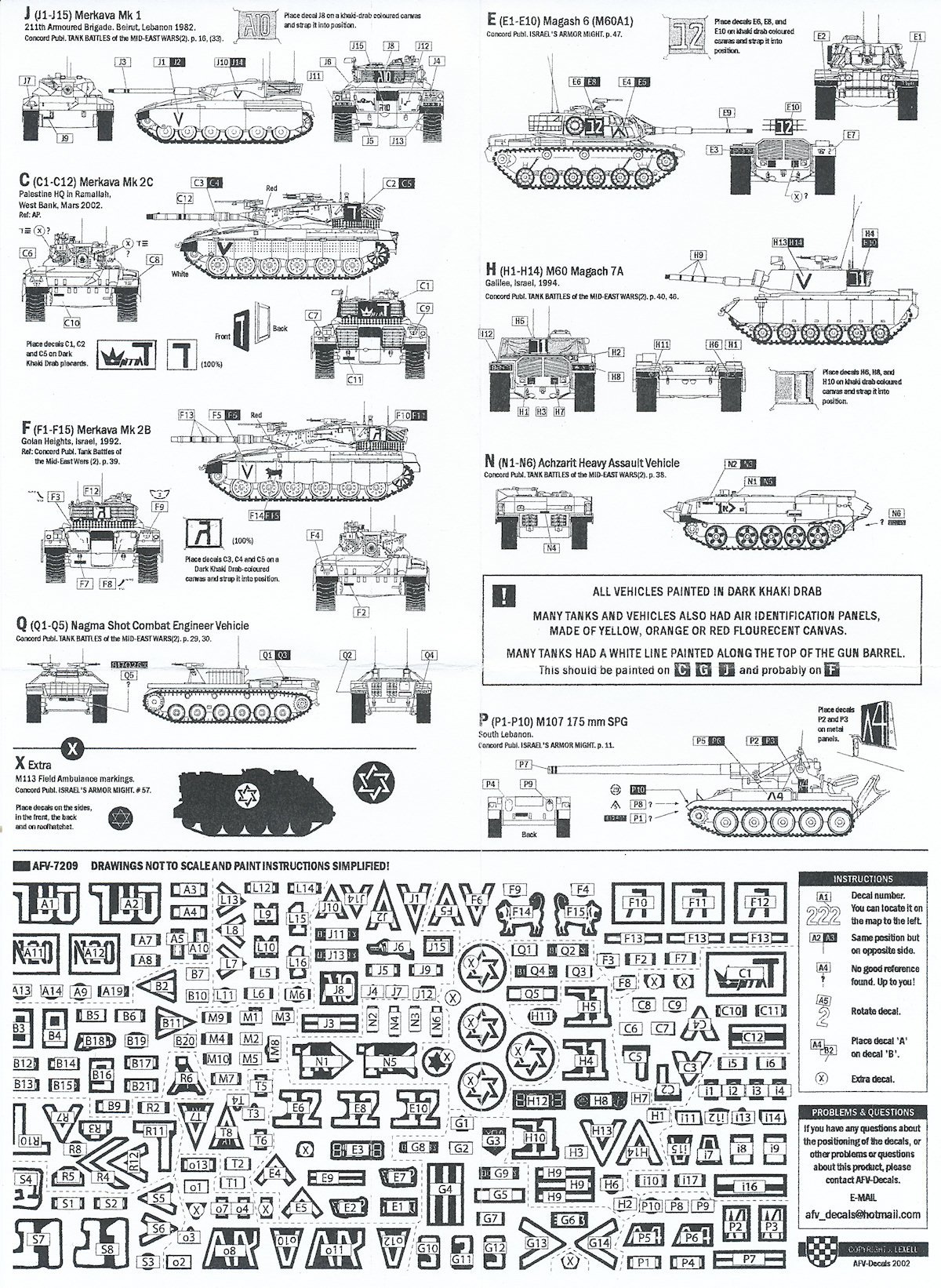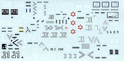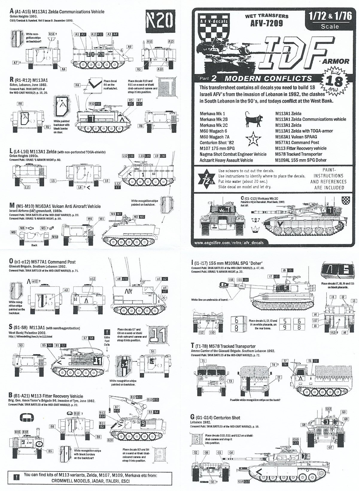 Not quite as diverse as the IDF Part 1 set, but still including a wide variety of vehicle types, this is a must-have set for those modelers into modern AFVs. Like all of the AFV-Decals sets, this one includes complete painting and markings guides for each vehicle, as well as reference listings for us to research specific details about each vehicle being modeled. While many of these vehicles aren't available in 1/72nd, they should be very easy conversions of existing kits. The scan to the left has had its contrast altered to make the white more visible, so the actual decals are a little more colorful, with some dark blue and orange markings. Notice the hand-painted appearance of several of the markings. Like all of the AFV-Decals, these are very well printed, very thin, and registration is perfect. |
