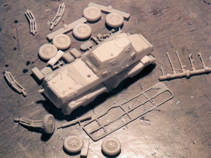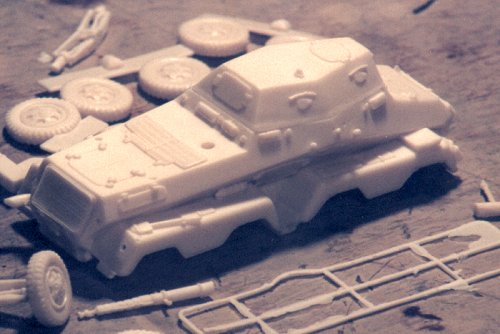 Al-by's Sd Kfz 263 radio equipped armoured car is another great kit from this French manufacturer. Moulded in the usual light yellow resin, the detail is definitely "Al-by" - the standard for resin small scale, in my view. There are a few small air bubbles to be filled and some flash to remove (particularly from the "bedframe antenna) but nothing serious. The hull is cast as a solid block, so it cannot be opened up without great difficulties. Steve Guthrie, a noted master of small scale armour here in Canada, says that one of the most important things in any kit is getting the wheels right. If the wheel aren't correct, it doesn't matter how good the rest of the kit is - its not going to look right. In this case the wheels really make the grade - very nice moulding and tread pattern. Only one thing concerns me, the kit shows a noticeable demarcation line between the "regular" hull top and the added radio compartment (see closeup). This line does not show up in the colour plates I have. I'll have to check some of the photos to see whether this line has to be puttied over. Now I have to decide whether or not I'm going to attempt doing it as an Aufklarungs 3 armoured car from North Africa (mud cammo!!).