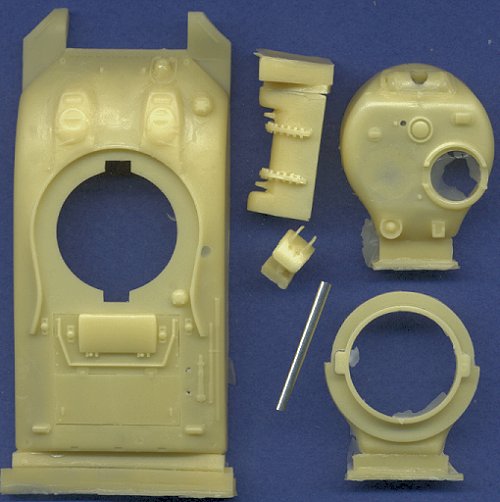 Now we get to the turret. As with the hull, this is a modified plastic piece from the original ESCI kit. It is modified by "filling" in the loader's hatch, and altering the gun mount to represent the early M34 mount. The gun mount alterations aren't too bad, but once again, the hatch filling and sanding need to be redone by the modeler. On the positive side of things, at least the commander's hatch was left open.