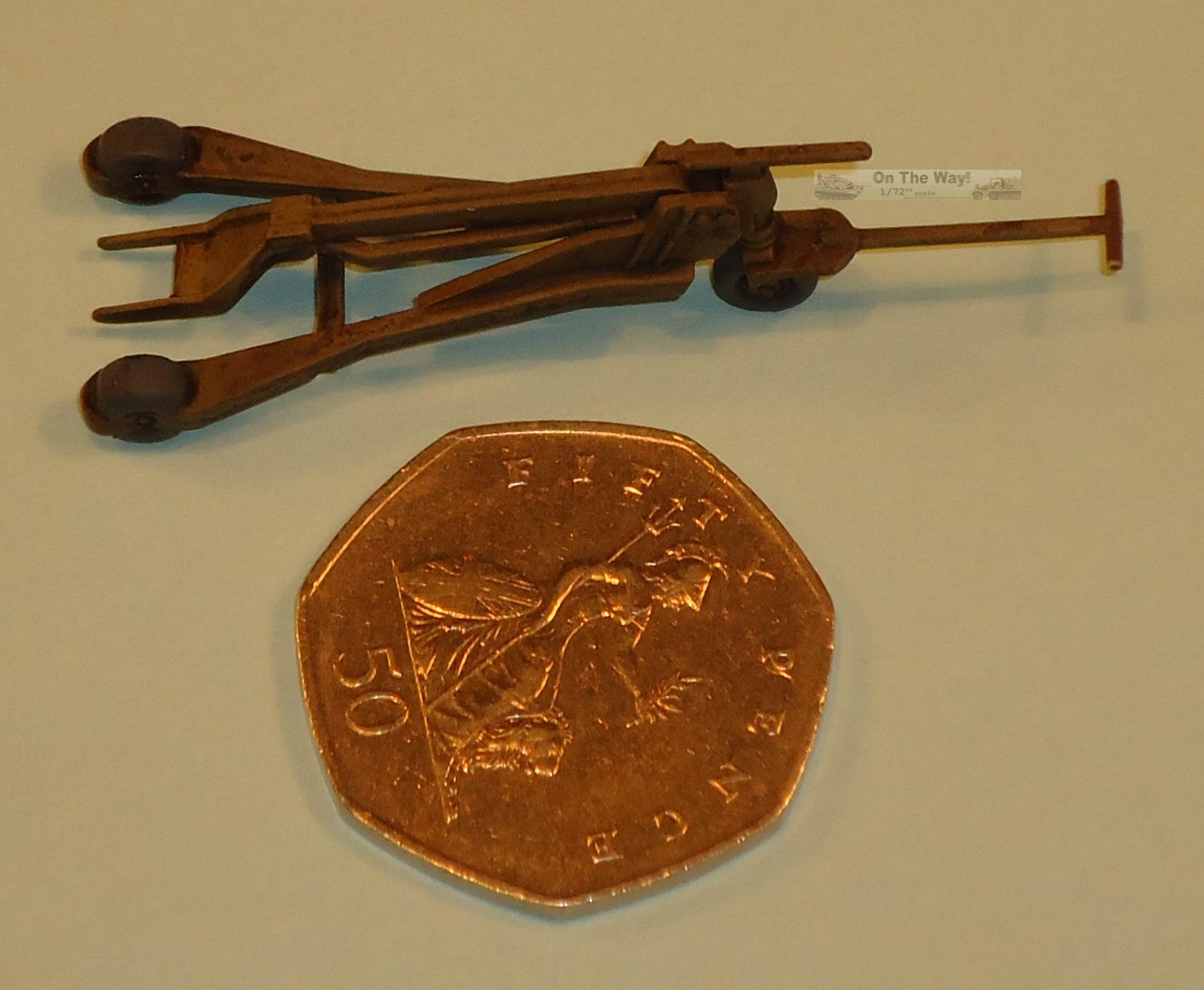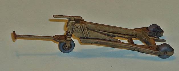 Comparison of the pictures above with the Academy parts below immediately shows that Academy has simplified the trolley enormously in the area of the wheel arms. There are no technological reasons not to be able to get a better rendition, even if you try to do it with a single piece. Being rather lazy, I limited my remedial work to some carving around the wheels, to make them stand out better. This is highly insufficient to capture the fragile look, as you can see below in this 1/32 model, but it will have to do. Notice, in the picture above, how frail the 1/32 model looks, compared to the 1/72 rendition we have here.