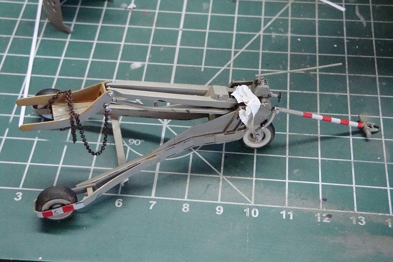 As you can see in the pictures above, the towbar is rigidly attached to the nosewheel, making it float into the air. Mine will eventually rest on "something". The nosewheel itself can not be turned/steered without some (minor) surgery, but the lifting arm can be positioned even after assembly.