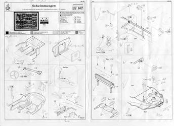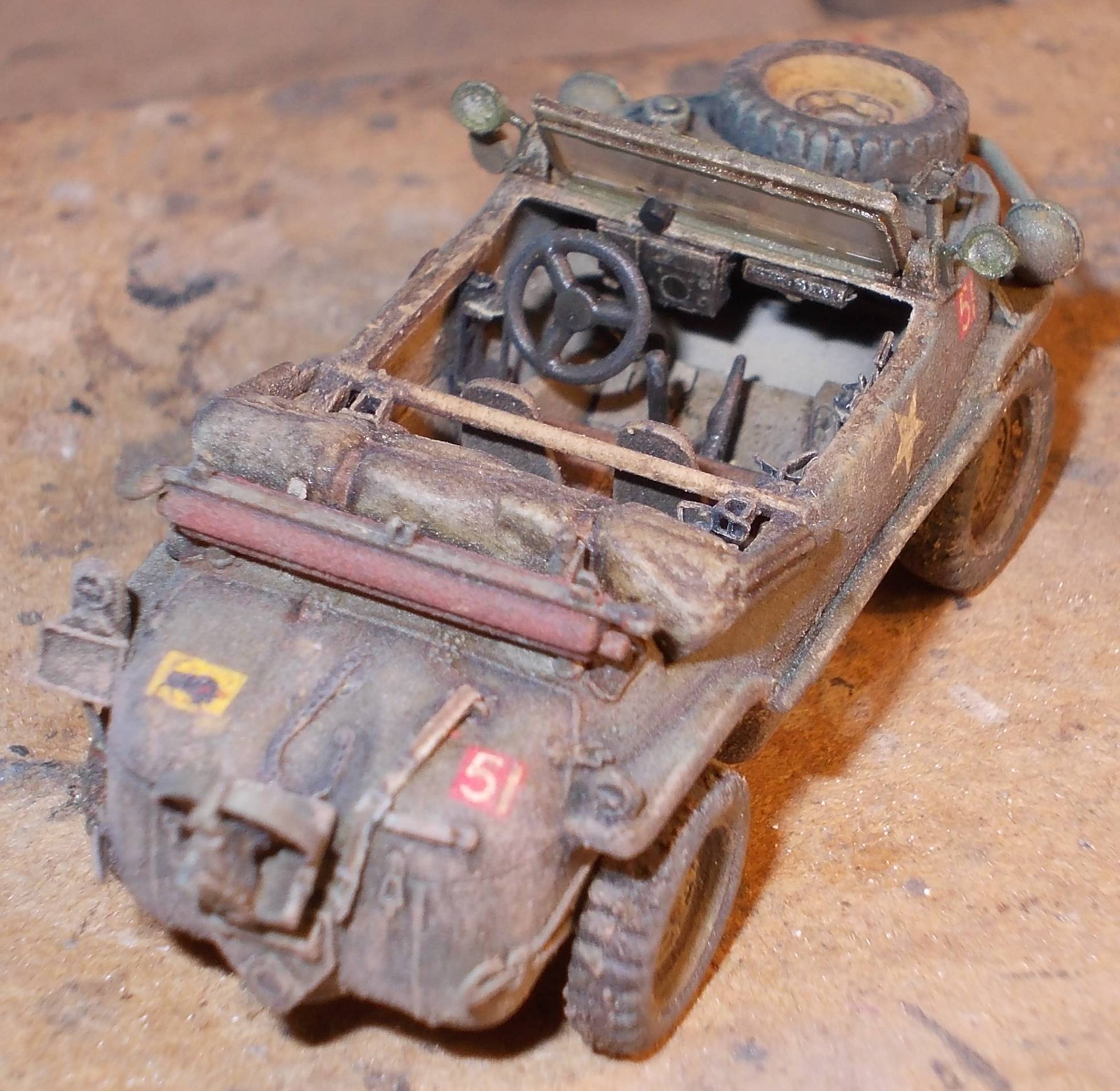 latter were beyond the reach of my modeling skills. It's a pity that Academy only provides a stowed hood, and, to boot, one that doesn't even fit nor exactly look like a real folded cover would. The oar that is fitted just below it also gets in the way, so this really is an area where Academy messed up quite badly. I needed to shorten the oar by a couple of milimeters to make it fit. As I was trying to build the exact same vehicle as in the picture below, I didn't fit a Notek (neither front or rear), but I did fit the shovel. The picture doesn't show it, but it might have been fitted. I cut off the attachments of the Eduard shovel (which is too flat) and added it to the Academy plastic part. The MK72 wheels are a drop fit as they replicate the fittings of the Academy kit very well. Only minor clean up of the thread and priming were needed. Eduards also provides a command pennant, by the way, which I didn't use. For those building a regular German Schwimmwagen, note that the interior fittings seem to be meant to hold an MP40 and Panzerfaust, and that an MG would probably have been fitted. Personal gear, like canteens and gas masks would be fitted in the (by then) crowded interior. Some minor additions/modifications were performed at the very end. I replaced the exhaust stubs with bent styrene tubing, to make them point to the rear. For those who want to go even further, two small pegs might be added to the top of the windscreen (which held the canvas top in place), and a horn placed below the right front fender. (The picture of "my" vehicle didn't show this area.)