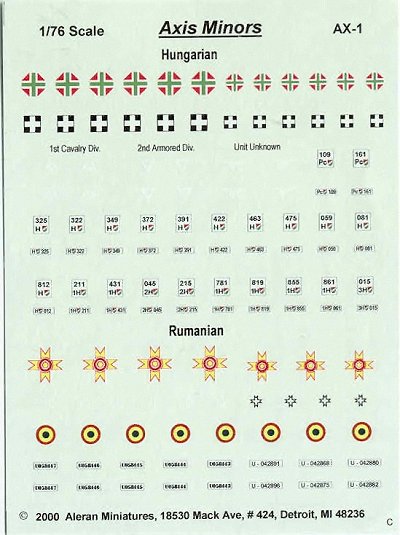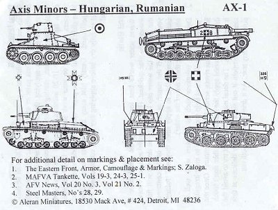 I have not used them yet but look forward to trying them as a refreshing break from German and Soviet markings.  The markings appear very sharp, delicate and in register.  Usable for R1, R2, Czech 35t tanks, Zryni, Pz III's and Pz IV's used by Rumania and Hungary during WW2.  Both early Eastern Front and late Eastern Front markings are included as well as license plates for AFV's and softskins.