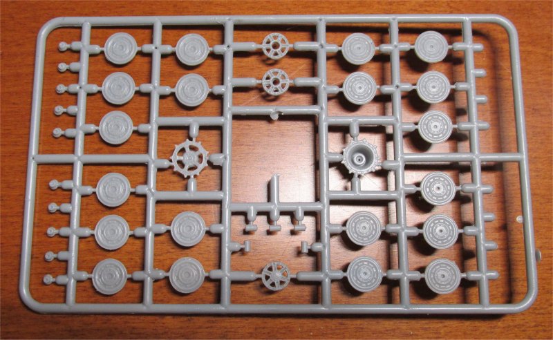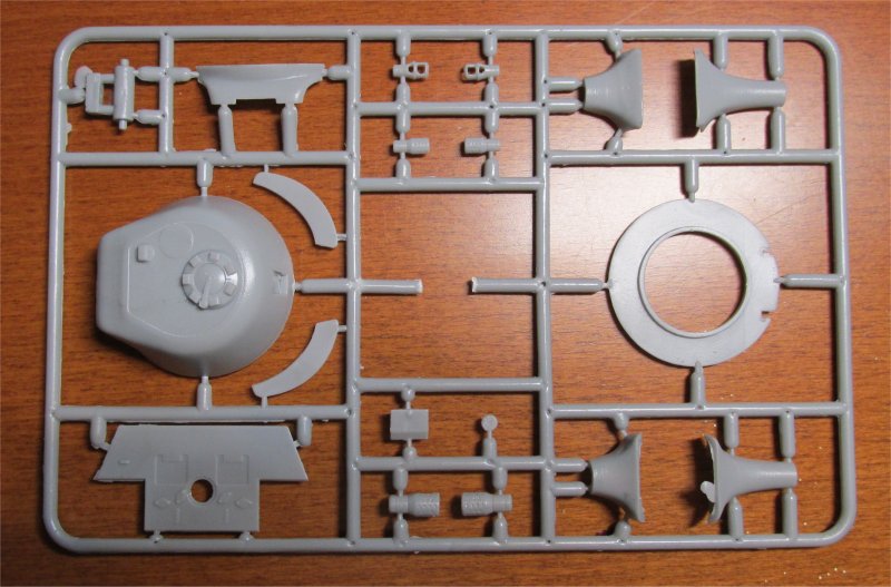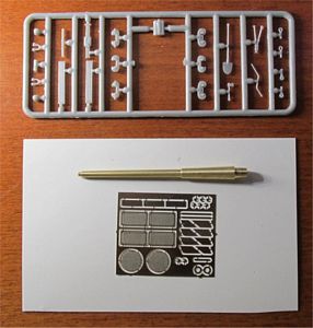 Packaging On opening the box, you find 6 large sprues in light grey plastic and a small bag containing another sprue with tools, 1 PE set, a turned metal barrel and 1 small set of decals with some tiny german crosses. |