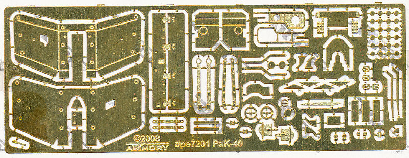 | This set was designed for use on the Roden PaK 40 kit, but when you look at the parts, it seems that this set can be used for just about any PaK 40 kit. The real highlight of the kit is the two-part gun shield. There is no way that a plastic or resin gun shield will ever look as good as one made from photoetched parts. I also particularly like the shovel blades being separate parts, though they may be a little small? |