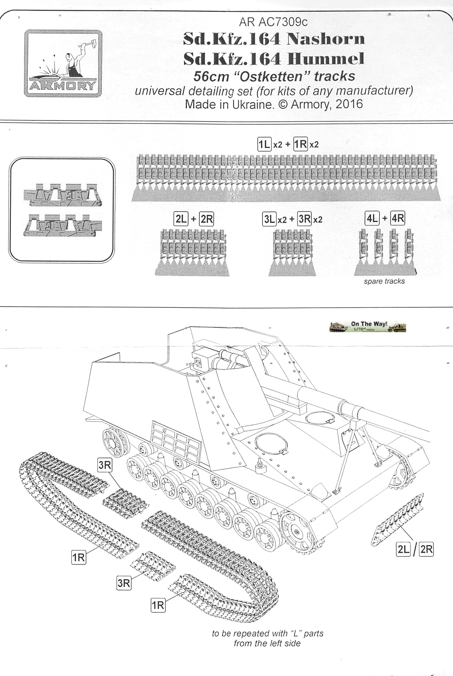| After the first encounters with the Russian climate (and its effect on the road conditions), Germany developped wider tracks for their Panzer III and Panzer IV (and their derivatives). Two types saw service: Winterketten and Ostketten. The former (which appeared first, in the Winter of 1942/43) was basically a standard track with extensions (similar to "duckbills" for Sherman tracks), while the later was a wider, more uniform track, somewhat reminiscent of a Panther track. This set of Winterketten is based on a late type track (with chevrons). Note that Winterketten are very rare on Nashorns and Hummels, while much more common on StuG and PzKpfw. Technically, there is no reason the Nashorn/Hummel could not be fitted with Winterketten, as the tracks were exactly the same as on the StuG III & StuG IV and PzKpfw III and PzKpfw IV. Still, the only pictures I have found of a Hummel with Winterketten is here and here. Given that the tracks of the Hummel and Nashorn were a tad longer than those of the Panzer IV and even more so than those of the Panzer III, I guess that buying this set will allow you to procrastinate when making up your mind about the vehicle to use them on.