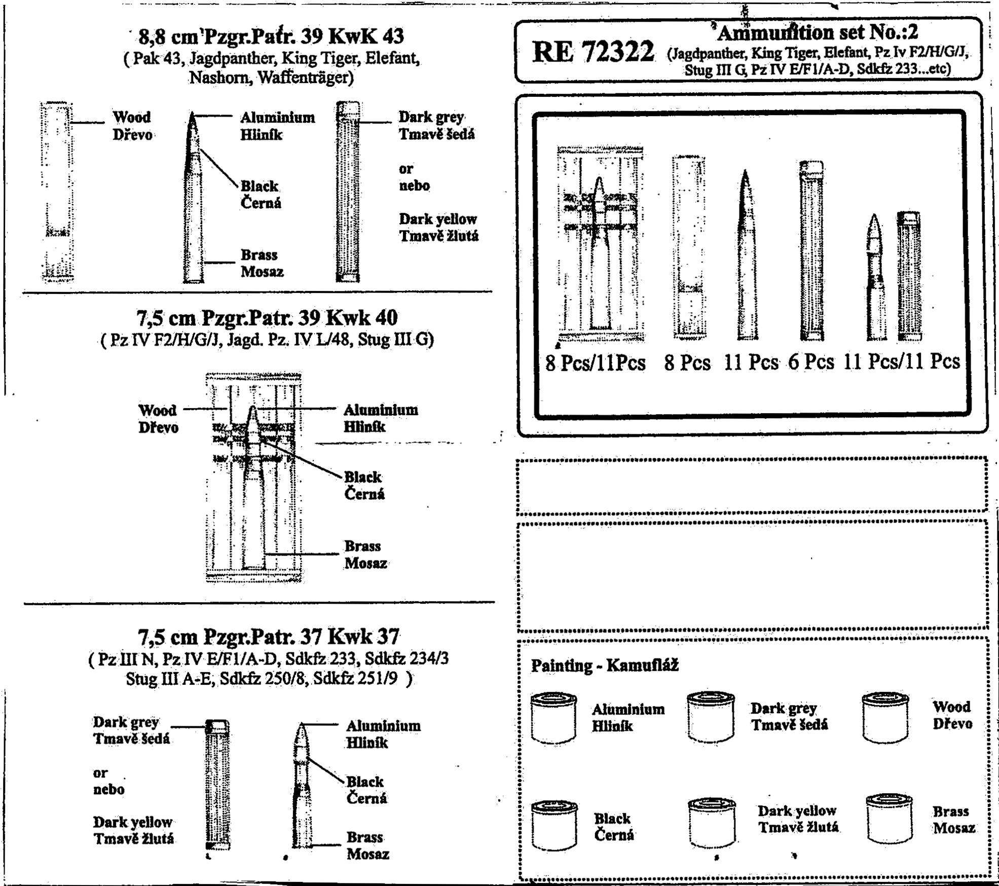 The set comes with 10 rounds of 8.8cm ammo, one empty shell case, five open boxes, three closed boxes and six closed shipping tubes. For the 7.5cm long, we get 10 whole rounds, one empty shell, five open boxes, and three closed boxes. And finally for the short 7.5cm, we have 10 complete rounds, one empty shell, and 11 shipping tubes. Comparing the accuracy of the sets, we have
