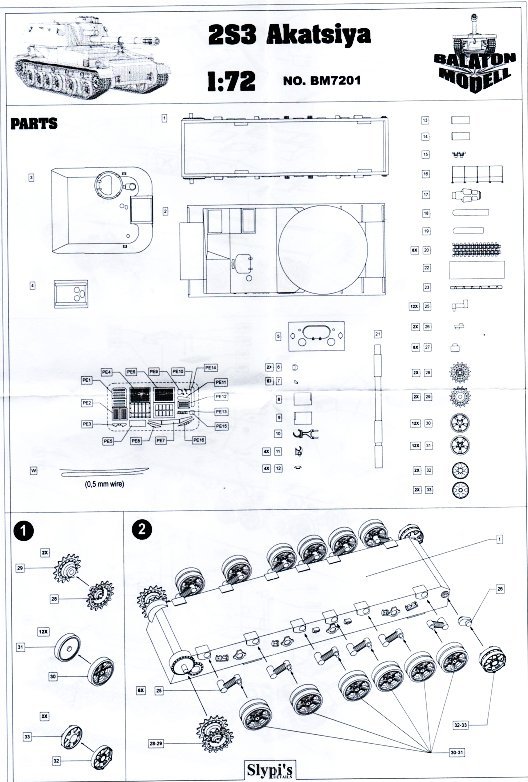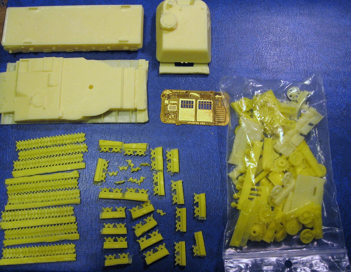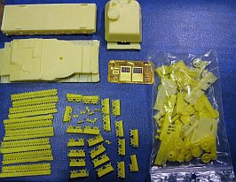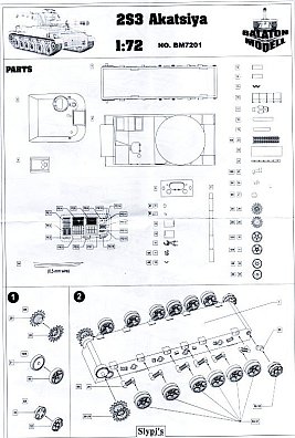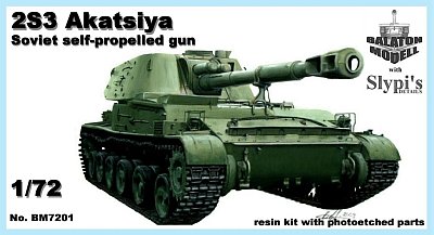 This resin kit is packaged in a cardboard box with the subject picture on the front and plan views on one long side of the box. All of the 100 resin parts are in four ziplock baggies. The resin is a weird lemon yellow with a few lighter colored pieces thrown in. One baggy has a photo-etch fret with 15 pieces, one baggy with the track pieces which consist of 50 individual track links and 8 track lengths. One piece of wire is supposed to be included, but my kit was missing it. The other baggy is stuffed with the rest of the kit parts. Very small amounts of flash are present as are some pour blocks, but they are not heavy handed. The instruction sheet is an excellently rendered CAD-type drawing, double sided, that locates everything for the most part, in a clear manner. Another smaller sheet of paper shows some of the other kits that are available in 1/72, all modern, all Warsaw Pact with the exception of a U.S. HET M1070. Balaton Modell's kits are not cheap, but are priced in the normal to upper-end of the kit price range. The largest parts are the turret and the 2 piece, horizonally split hull. I find that part disturbing and quite unusual. There are four slots to line the halves up, so it should work out, but I can't see the reason to do it unless there are further models forthcomming that will use the lower part of the hull, but not the upper (or vise-versa). Information from the book Russian Military Power circa 1980: The 2S3 was known at some time past as the 152mm M-1973, able to fire a shell 18,000 meters. A battalion of 18 of these were allocated per tank division. The vehicle is built on a modified SA-4 Ganaf chassis. I'm sure more about this vehicle is on the web and I believe there was at least one of these beasts on display at the Duxford Museum, England, in desert colors around the 1998 time frame, stored outside the Land Warfare hall. |