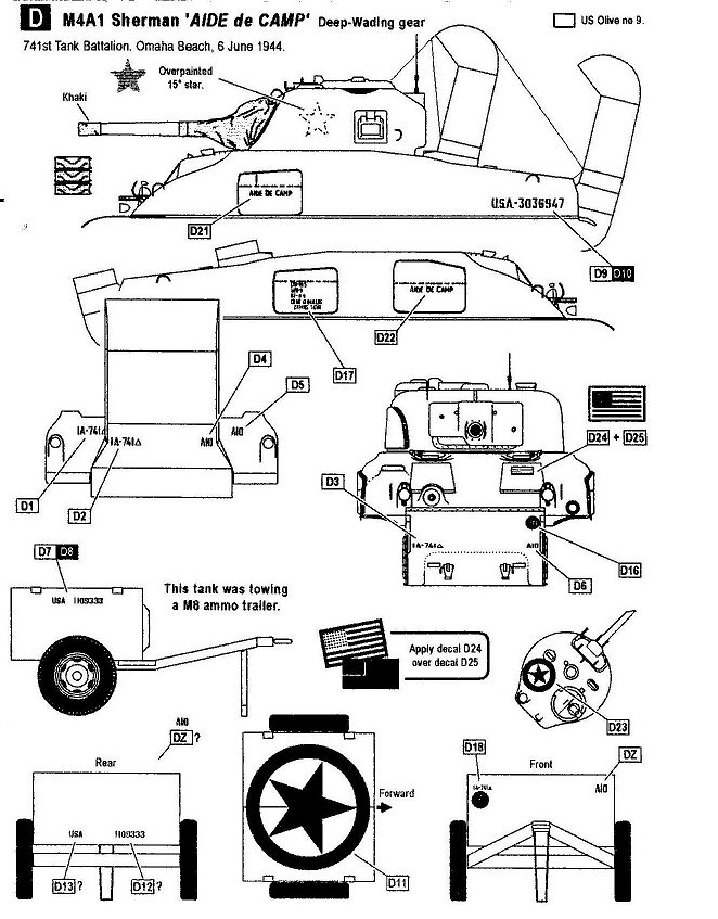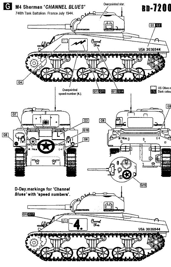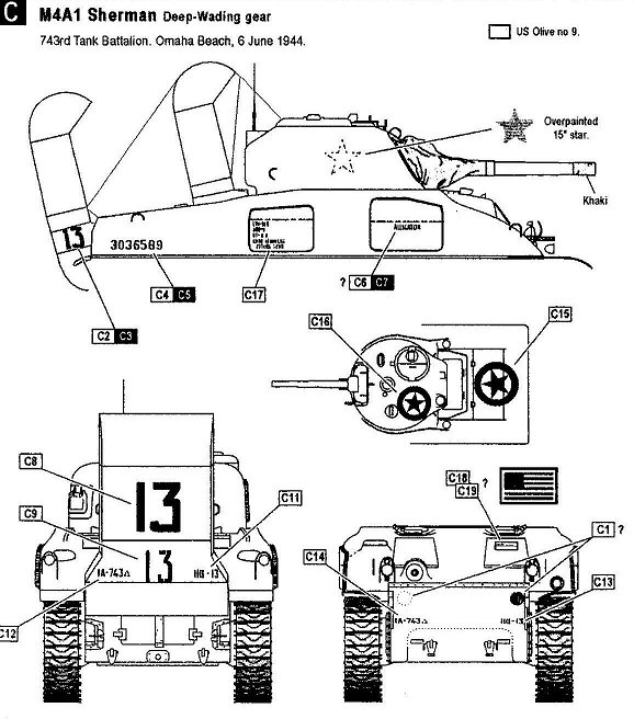 TB HQ-13 ALLIGATOR I think this is the most controversial tank in this set: in the only three stills I’ve seen of it (on British Pathè), it seems to be a PSC tank with the cast-in armour thickening hull and the pistol port, cast-in armour thickening and loader hatch turret (low bustle). If so, it shouldn’t have appliqué armour. The tank was far from the cameramen and the images are not as clear as I’d like, but I hope to be in the right. Unfortunately the serial and the name are not readably. If I’m right about the photos and my counts, the serial numbers should lie in the batch from 3069997 to 3070396. The suggested 3036589 is right for a M4A1 of a former PSC batch. Furthermore, as far as I’ve found, the large white numbers on the wading trunk were typical for the 741st TB, while the tanks of the 743rd TB had the individual numbers on the turret sides. After a long agony, I decided to follow my interpretation and my model was made as the 741st TB HQ-13, without the name and a fictional (but possible) serial. Should new evidence ever confirm my conjectures as wrong, a mud spot will miraculously drop on the bumper code, the tank will change identity and a name will appear on the hull sides. |