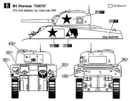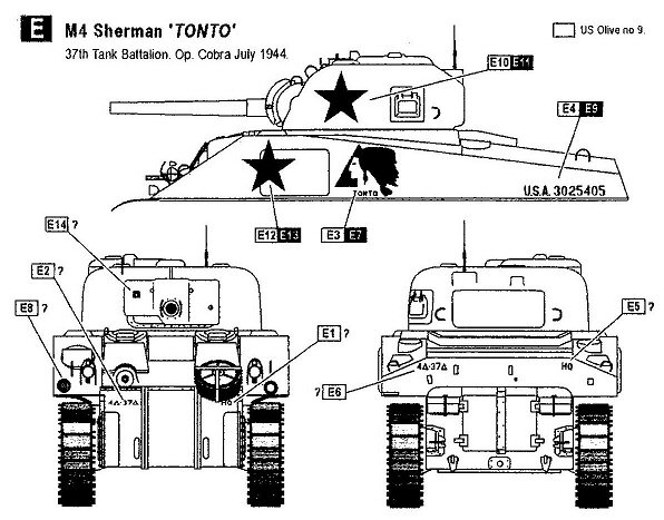 AD 37th TB HQ-_ TONTO In the only photo I’ve seen of it, the rear plate and the serial are not visible, however by the antenna bracket it seem to be a Pullman tank; the serial suggested (3025405) doesn’t match the numbers I know. I don’t know the individual number; it had the cast transmission cover (in the photo it seems to be rounded) and the pistol port; no horn is visible (may be on the fender?). The spare wheel on the glacis is absent (there is a spare track length between the hoods) and the position and the rack suggested are typical of the 69th TB 6th AD. |