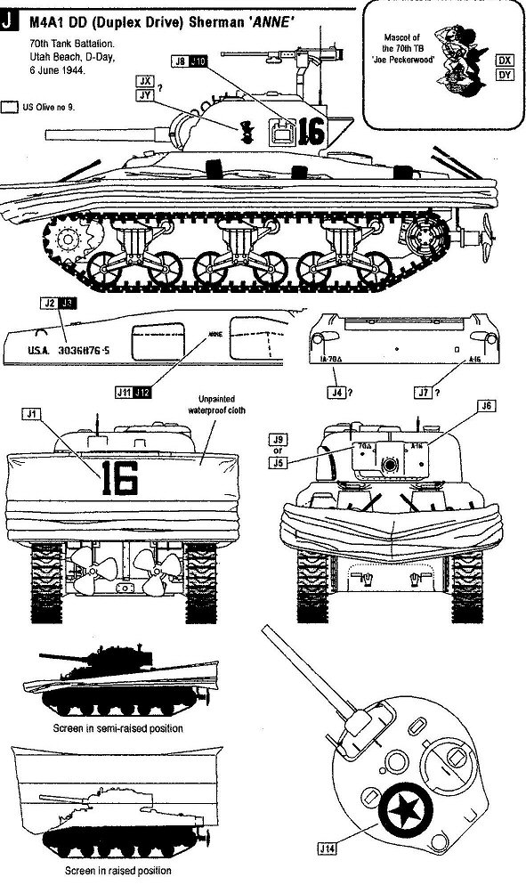 TB A-16 ANNE This was a PSC tank and certainly not a DD, but rather a replacement tank as witnessed by the standard idler, the standard brush guards and the hand painted turret number. It had the pistol port and no appliqué armour on the glacis. On the visible side the unit badge is missing. On the other turret side, because of the pistol port, the number should have the lifting ring between the “1” and the “6”. |