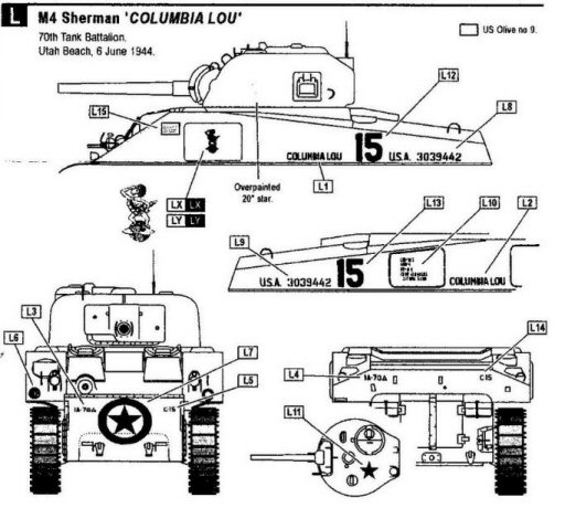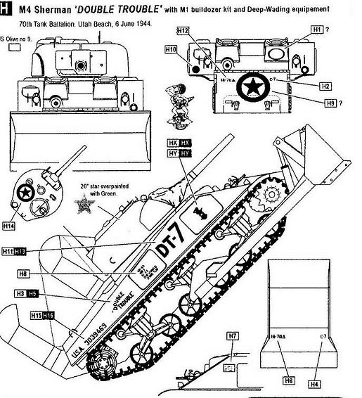 TB DT-7 DOUBLE TROUBLE It was a Pullman tank. In the photos I’ve seen the transmission cover is not visible. Anyway, being produced in the mid of the 2nd batch, it should have the cast one. The right turret side shows, under a large mass of personal items (helmets and backpack) the smooth bulged thickness instead of the appliqué armour, so it didn’t had the pistol port. One can doubt the individual “C-7”. Double trouble was one of the eight dozer tank attached to the 70th TB (two were sunk before reaching the beach) and I think they had their own sequence numbers and if I have to make it I’ll use “DT-7” also on the bumper code. |