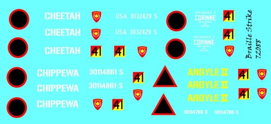 Modelers should be aware that the drawings used in the instructions are only meant as a help for placing the decals, and not for the specific features of the tank. For instance, CORINNE had a spare roadwheel mounted on the turret sides; ARGYLE II had both a roadwheel and spare tracks, together with a rack on the hull sides; CHEETAH had a faint trace of the previous white star marking under the new squadron symbol, etc. According to the instruction sheet, all of these tanks were equipped with T80 tracks. Looking