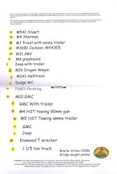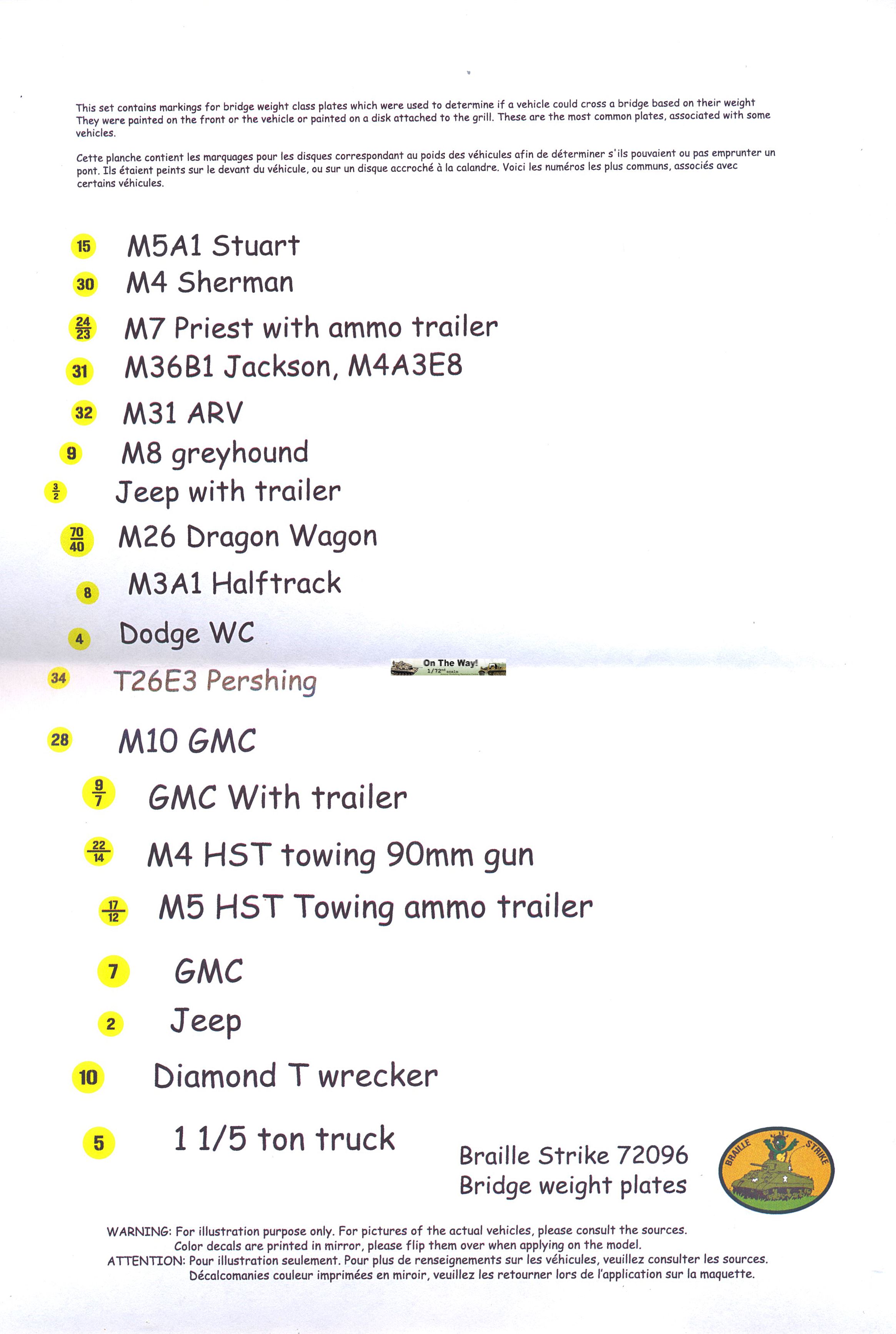 This set covers the typical Allied bridge weight plates for 19 vehicles (some of which are represented twice: with or without trailer). The image above clearly indicates which vehicles are covered. 5 decals each are provided. Looking