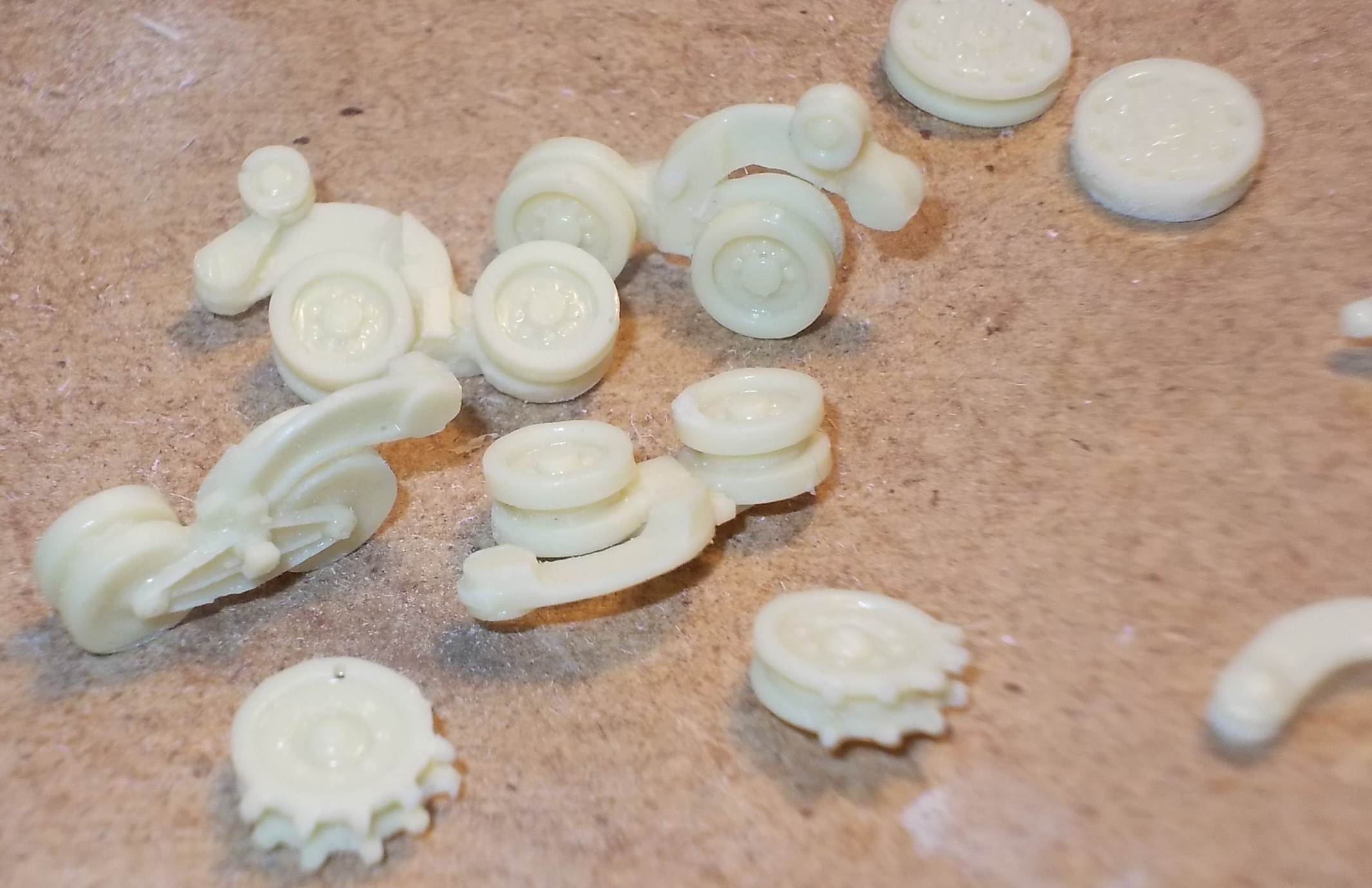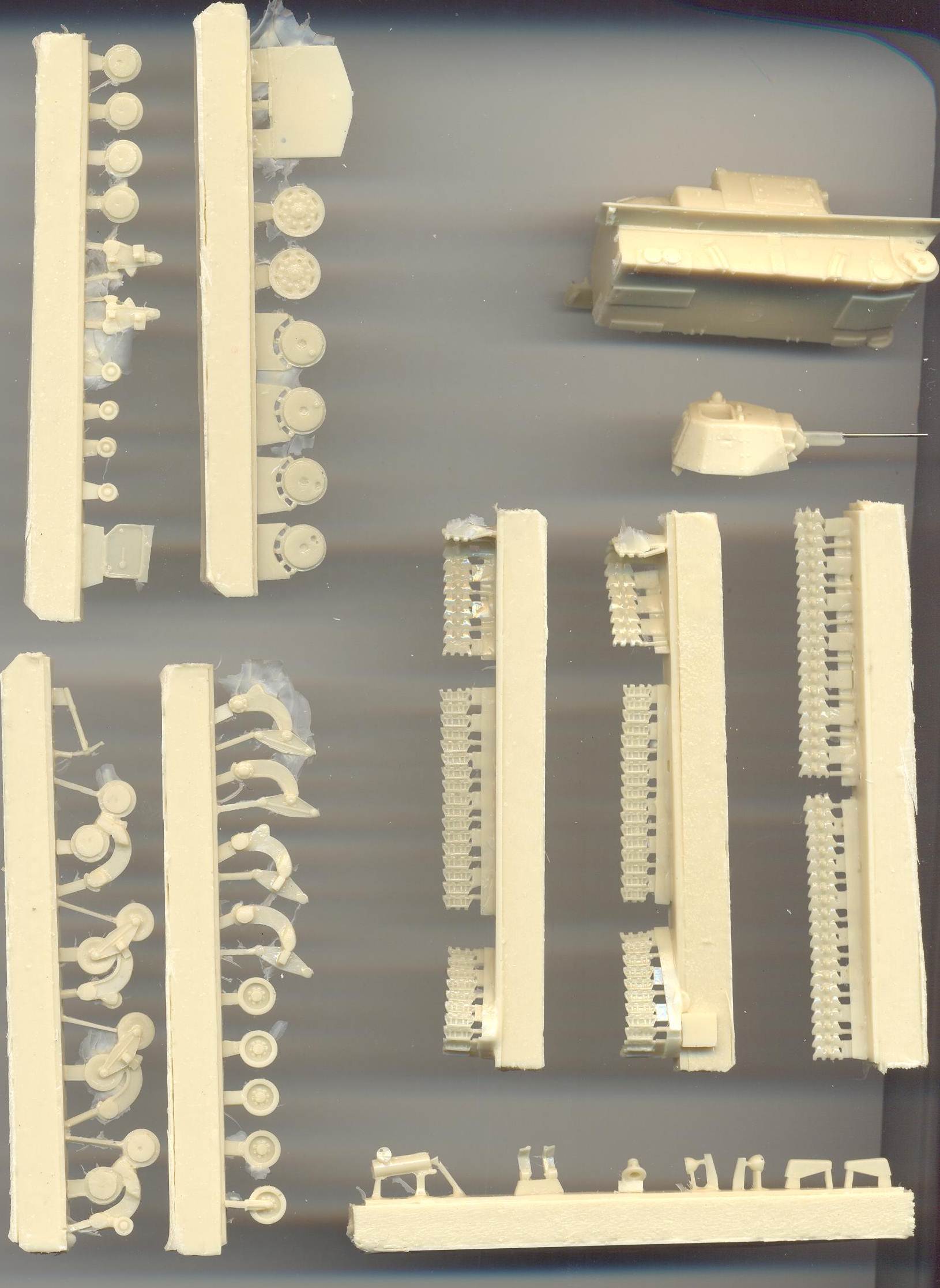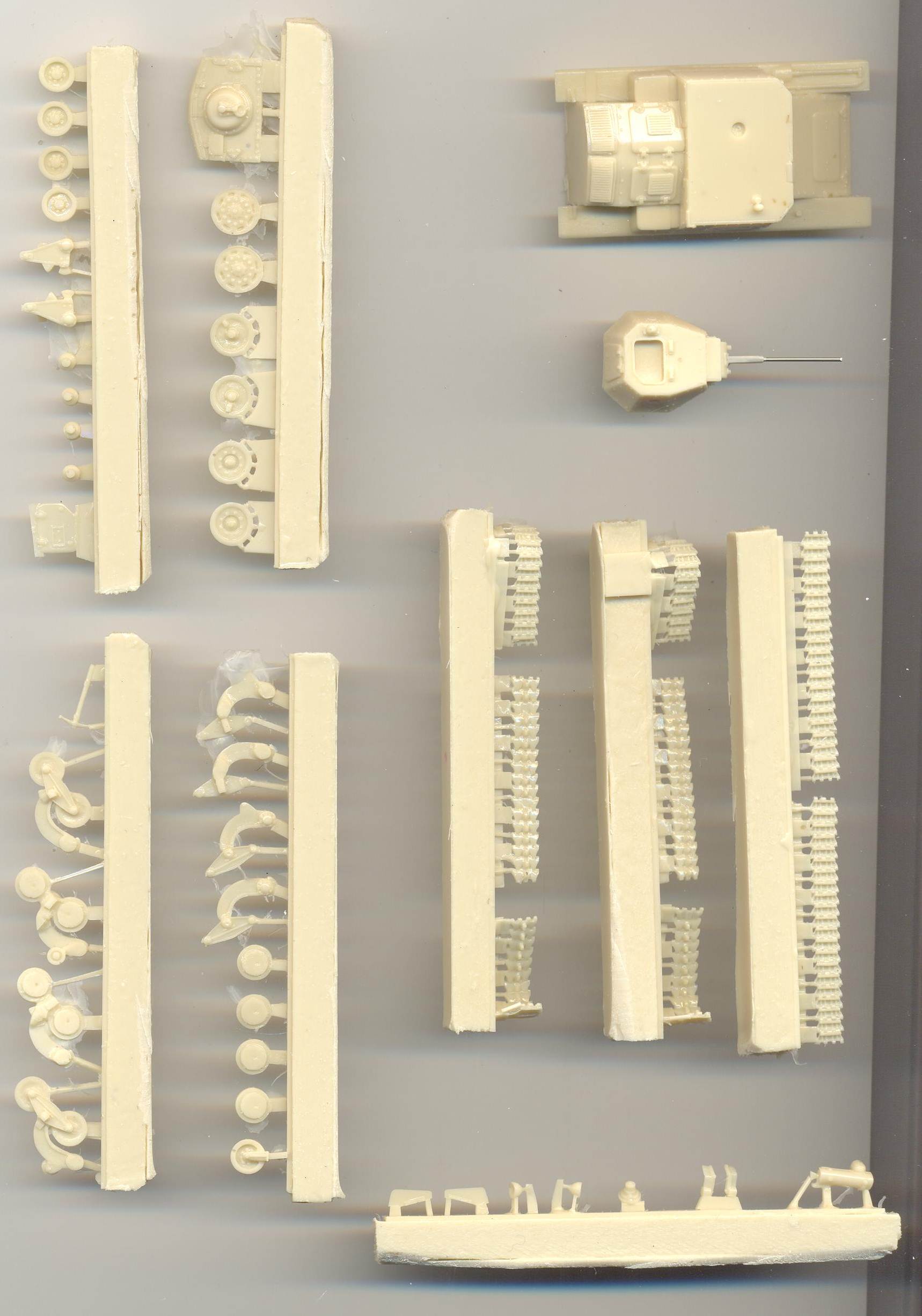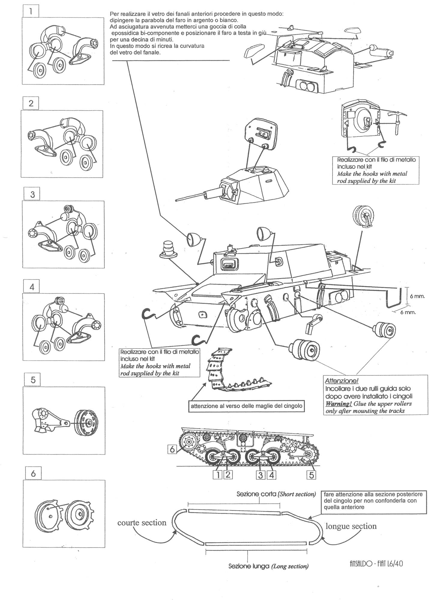 kit Parts are nicely cast, with no warping. Pin holes were few; warping or other defects were not found, except on the tracks, which suffer from some uneven casting to the point that I feel it is necessary to put the tank in a diorama so I can slap some mud on them. The manual is in Italian, with only partial English (and French) translations. I started by removing the bigger pieces from the molding carrots, most of them with a motor tool. The motor tool ensures a clean cut, with less risk of a crack propagating towards the actual parts; it also ensures a lot of dust whirling around. The parts that required the most care were the sprockets as the teeth are easily damaged. Parts were then cleaned up with scalpel and sanding paper. The resin is very pleasant to work with: not too brittle, nor too flexible. Clean up is limited, by the way, with very little flash and minimal molding pegs. Five pin holes were found and filled in. Assembly