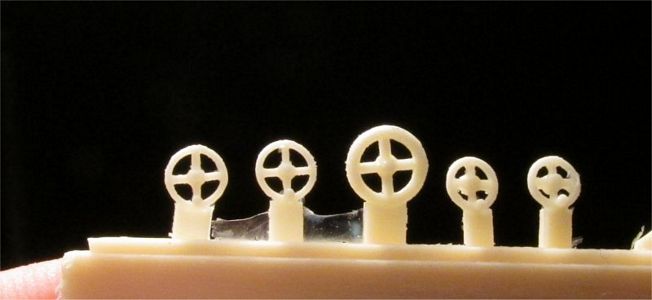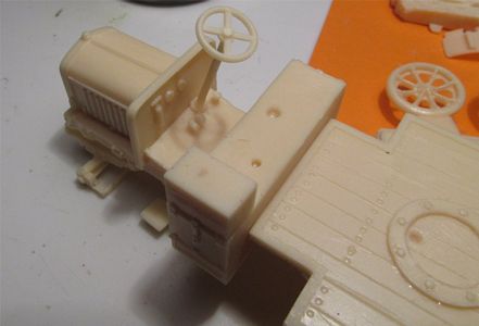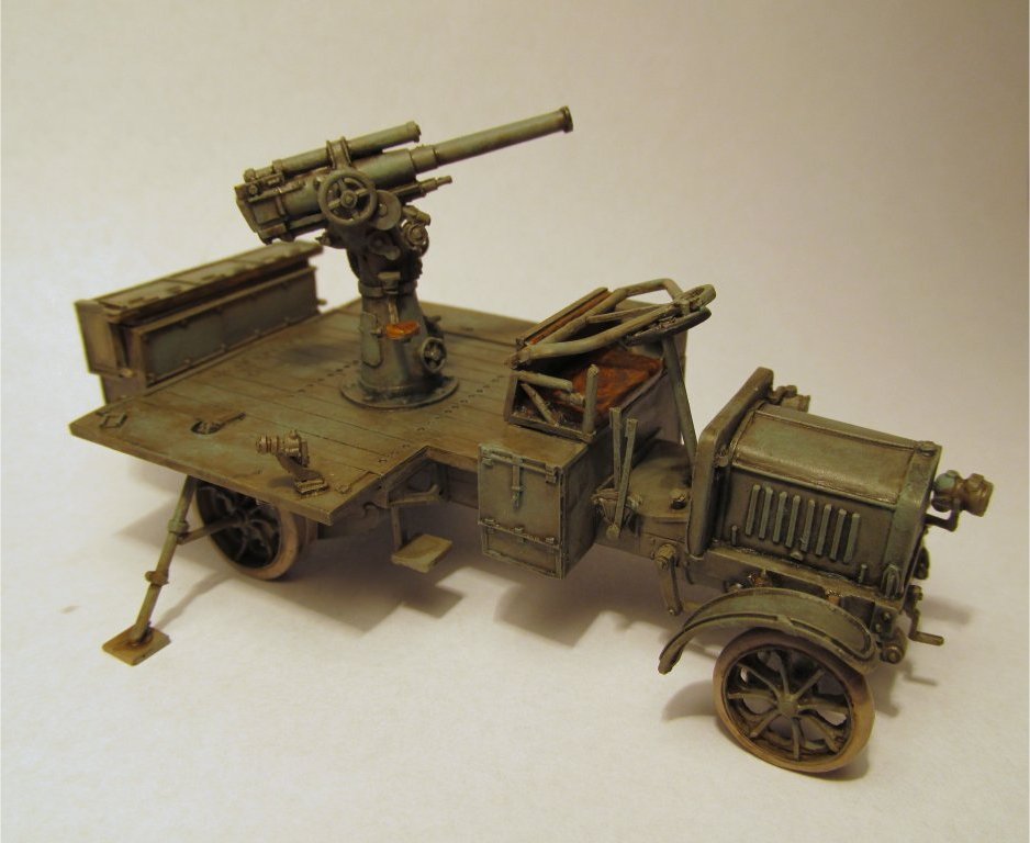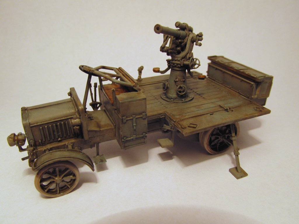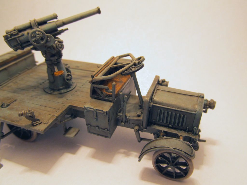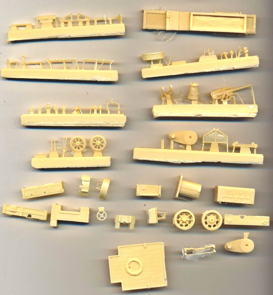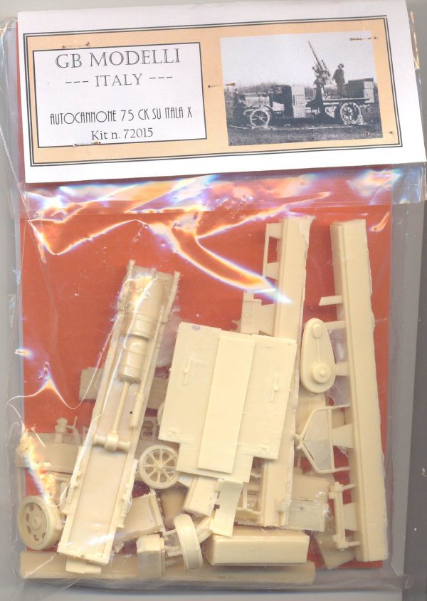 What you find inside the kit and how to assemble it The kit comes in a small plastic bag with the label at the top. The label has a small black & white photo of one of the most famous shots of this so old and rare vehicle. The model consists of around 60 light-amber-colored, cast resin parts, quite a great number for a resin kit. Parts are nicely cast, with no bubbles or warping. Many of the pieces are incredibly tiny and delicate, which made me think that I was surely going to break a number of them, which did not happen either because of my supernatural ability (difficult to believe) or because the pieces are intelligently secured, so that they can be removed easily. I was also surprised by the very small amount of flash which can be found. The assembly instructions are the standard exploded-view style with no written instruction. A brief inspection makes it easy to understand that there are no compromises between scale and historical accuracy. Every single detail is there: believe it or not, the three pedals are separate and must be assembled, as you can see from the photo below (one of the worst moment of my whole modeller's life was when one of the pedals fell to the ground from the tweezers - one of the best moments was when I got it back !). Two of the pedals are identical and must be glued close to each other and another one is different and must occupy another hole on the right. Despite their dimensions, you can notice the differences between the three and need to pay attention to choose the right one. Pieces go together very easily, so that no filing or cutting is required to make them go where they should. There are five very small and delicate wheels which must be glued to the gun: the bigger one goes on the right upper side, as it can be deducted by carefully observing the instructions. Speaking about the gun, it is a beautiful kit in itself, and it is also sold separately as a stand-alone piece (kit # 72014). The elevation is not fixed, even though you must choose the one you want before assembling the traversing mechanism, which sadly stops the gun from moving. The muzzle comes pre-drilled, even though drilling it would not be difficult. ![]() The vehicle can be mounted both in travelling or in firing position, and the differences can be clearly spotted in the instructions on the left. I know I am asking for too much, but it would have been really great if the ammunition container between the cabin and the gun were provided both in closed and open position, with the shells visible, as we can see it was during firing. |