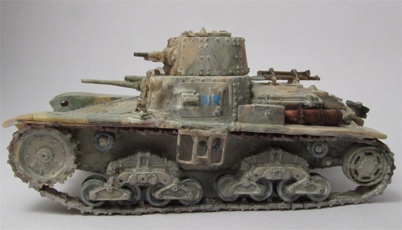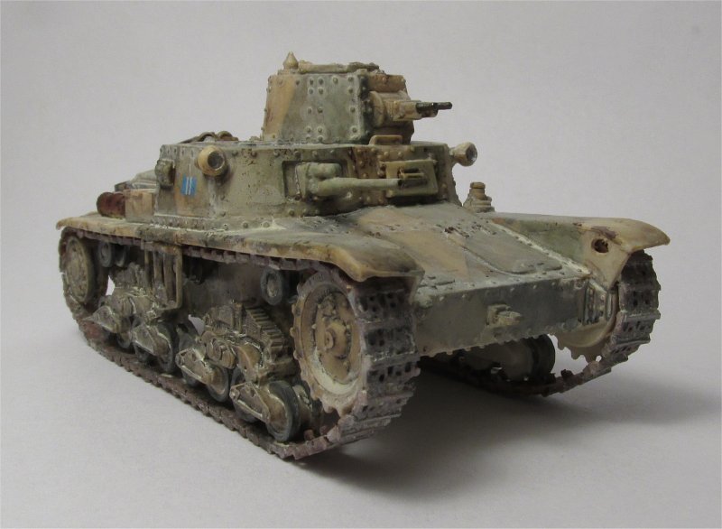 These vehicles had either a white cross (earlier) or a vertical Italian flag on the turret back, so I hand painted the last one. Also, they had a posterior license plate with numbers starting with 27, plus tactical markings which I took from an Italeri M13/40 kit.