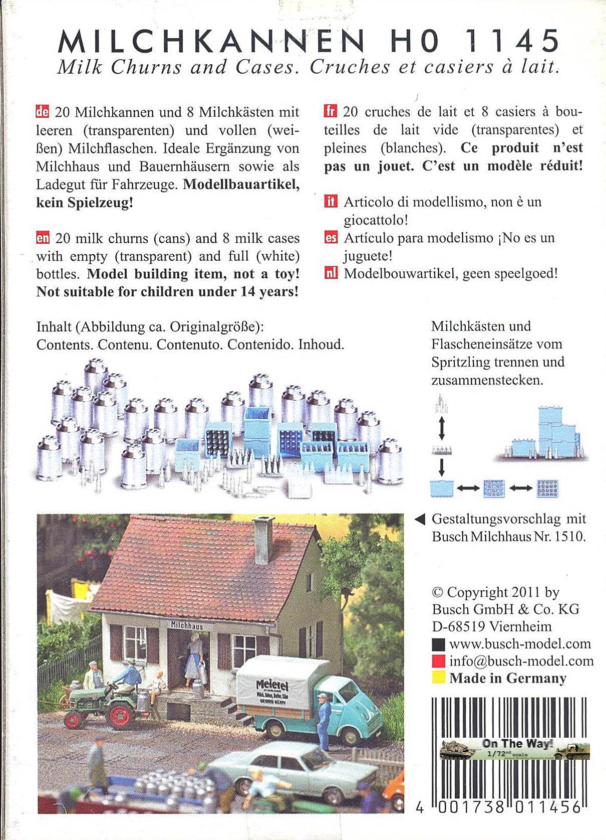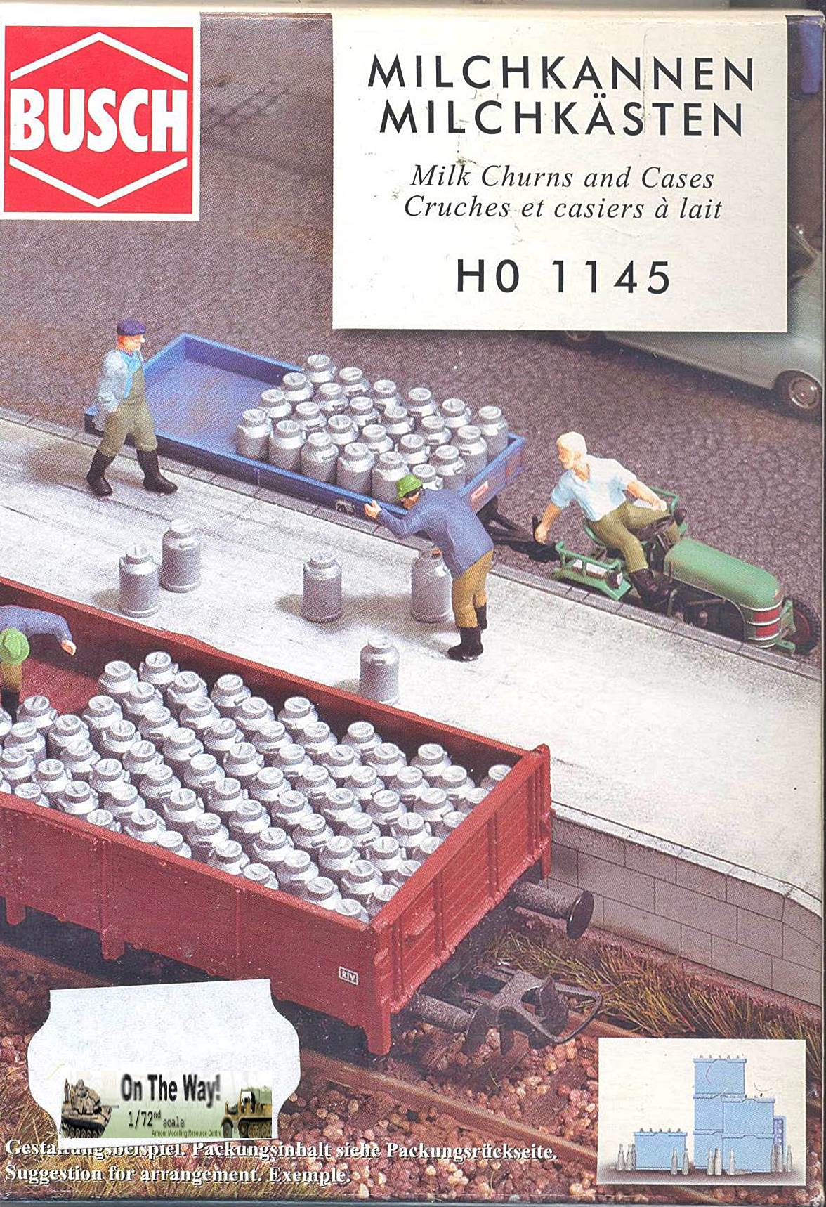 This set contains 20 traditional metal milk churns and 8 cases. The latter can be filled with white (full) milk bottles or transparant (empty) ones. The bottles come either as a pre-arranged set (for a full case), or as individual bottles, allowing a wide variety of arrangements. The churns would only need a slight amount of weathering to be a drop fit for a pastoral diorama, while the options for the bottles are almost endless.