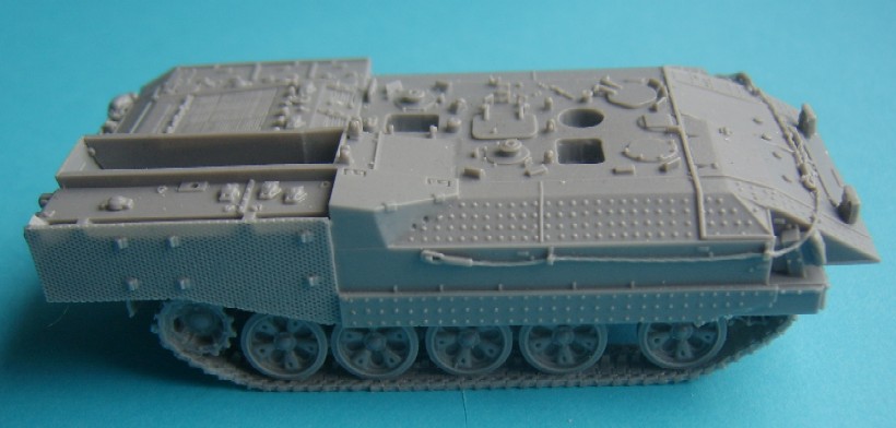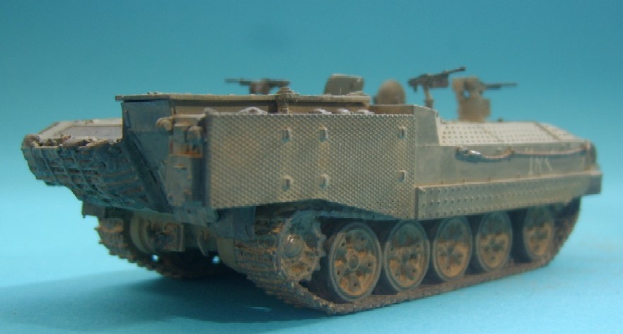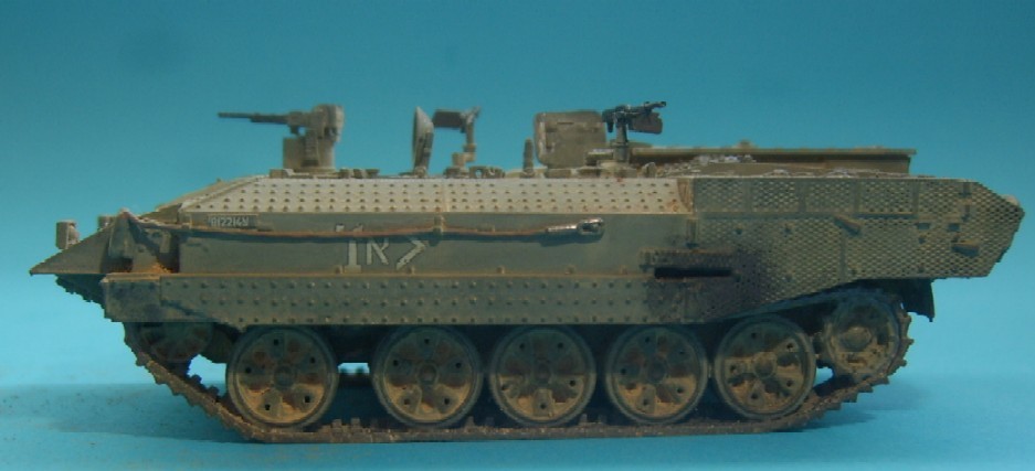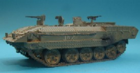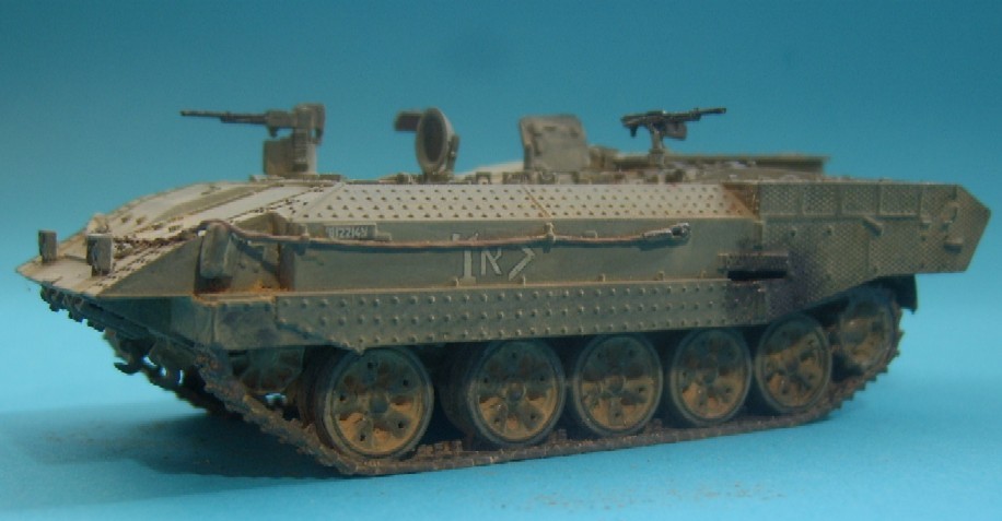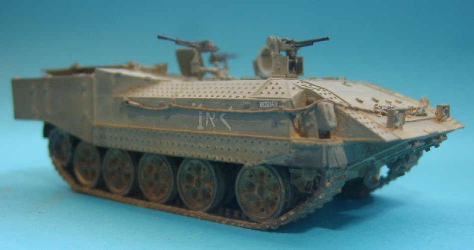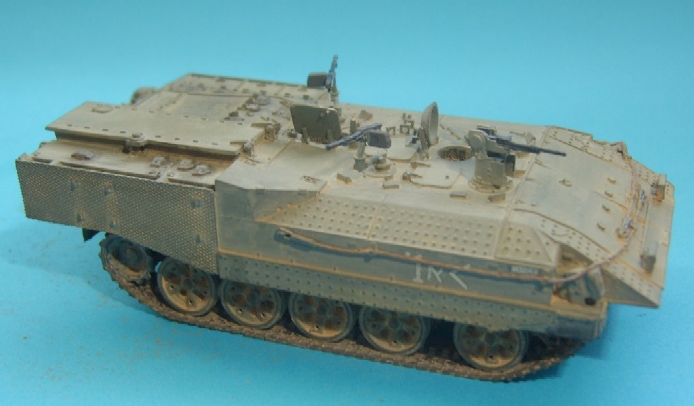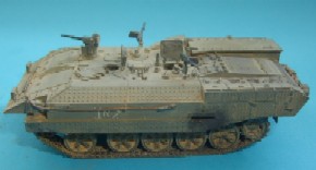 At long last, one model I never thought that we would see in 1/72nd from any manufacturer and as usual after starting to build my own and one gets released ! along with all the others I am building to follow, so it is back to the drawing board for me. The Achzarit is a Heavy APC based on the T-54/55 hull, of which the Israelis' captured a lot of during the 1973 war. The infantry requested a survivable APC for urban combat, able to withstand strikes from the numerous RPGs' and other light AT weapons, the ideal idea, would have been to use the Merkava hull, but as the production of Hulls were needed for the Gun tanks. The solution was found in the IDF storage depots, where several Hundred T-54/55s' plus some that had already been converted to the Tiran were laying. it was available, suitable, due to its thick armoured shell and a very cost effective use of surplus and obsolescent hulls. Back to the kit/Model, Well was it worth the wait? I'll say so! Anybody familiar with the Combat 72 range from Cromwell Models will know what to expect, the Hull, Tracks and most other parts are moulded as one huge block of Resin,with just the hatches and machine guns to add, but the detail is Fantastic. The purist may wish to change a few features, mainly the Toga Armour at the rear, as this could benefit from some PE and is not too big a job to change, even for a novice to conversions. As you can see from the pictures, the hull is well detailed with 4 of the six hatches being able to pose open. The few bits that there are to add, mainly the hatches and guns. The ammunition feed for the sight mounted gun is there, unfortunately mine broke towards the top. The kit scales out to the plans that I have although the nose is shorter than my plans, but judging from photos' of the real thing the Cromwell kit looks to be right, I have no actual measurements for the Achzarit, but I do for the T-54/55 on which it is based. The track and wheel spacing is correct. All in all a very nice and simple kit to put together, The rear ramp is detailed both inside and out should you wish to display it open.The level of detail is amazing for the simplicity of the kit and it will appeal to both wargamers and the static modeller in equal measure. No decals or Instructions are included in the kit, so a few references might be helpful, but the pictures on the net are more than enough help. One piece I did have trouble with, was this small piece, As far as I can work out it is a mortar and it fits next to the LHS hatch, the only place I have seen it is on the Blast Models kit, I have not seen any photos of it actually in place on the vehicle. So What does it build like ??? Well very easily, it takes all of 20 mins to put the kit together, but then another 48 to paint and finish it ! There is very little clean up of parts to do, just a few mould seams around the front and rear fenders. The only change that needs to be done should you wish to model the vehicle closed is to cut some resin from the bottom of the sides on the rear troop exit roof and to cut down the operating ram on the RHS. Here's what it looks like made and painted. A great model to build, I had fun with the weathering and painting. I recommend this to all. References Modern Israeli Tanks and Infantry Carriers 1985-2004 by Marsh Gelbart Osprey publishing New Vanguard 93 Israeli Tank Based Carriers by Marsh Gelbart, Military briefs Various Web sites and discussion forums for pictures. http://idfmodelling.free.fr/refvehicle.html http://www.israeli-weapons.com/ http://www.geocities.com/moshe_madness/temple_mount_war/photos.htm http://www.waronline.org/en/