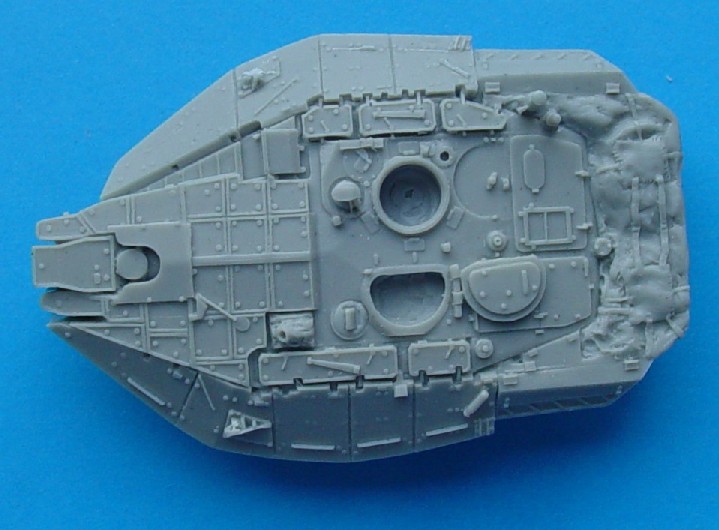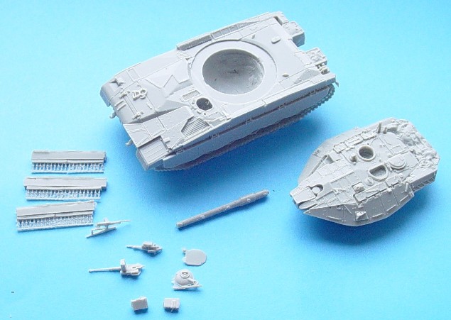 It was rumored that Cromwell models were going to move into1/72nd scale, but no one knew with what and those in the know weren't telling! then in late 2005 the models burst onto the scene with a definite IDF theme with two almost simultaneous releases of the Merkava 2 dor dalet and the Magach 6 Batash. The Merkava the IDF's own indigenous MBT, the Merkava 2 being an improved version of the Merkava 1. Thought by some to be the best MBT in the world and given the IDFs combat experience there is no reason to think why it should not be. The Dor Dalet version of the Merkava 2 is the IDFs latest version of this mark, some may think that if it is so good, why does it need to be uparmoured ? well the answer is simple, no tank is invulnerable to every type of attack and the Merkava 2s proved vulnerable to the Russian AT-4 spigot ATGMs around the turret ring and driver stations, and as the IDFs main policy is crew protection, these areas were improved, hence the Dor Dalet. So what do you get? well the suprising thing is very few parts ! with the hull and tracks and wheels being all moulded as one part! Given the amount of detail it is a testament to Cromwell's mold producing techniques that they have managed this. It should be noted that these models are a cross between a war gaming model and a static model and as such there is a bit of compromise in some areas. The hull comes moulded with all details in place, even the belly armour package is included, the standard of casting is exceptional the hull shows no missing part or blemishes, the only air bubbles to appear are in the lower belly which is out of sight and these are skinned over so no filling is necessary. There are two resin blocks along the bottom edge of the tracks that need to be removed, this results in there being no track detail but unless you want to model the tank upside down this shouldn't matter, the blocks are easily removed. It is nice to see that Cromwell have used the Esci/Italeri Merkava tracks, as these capture the shape and profile of the real Merkava tracks a lot better than the Revell Merkava tracks, Cromwell have added guide horns to the tracks and not left them blank. They have also improved the exhaust area, which now is larger and shows the correct slanted louvre's. Most of the parts that come in the kit are for the turret, with the exception being the drivers hatch, I made the mistake when taking the pictures of leaving the loaders hatch in position, this is a separate item and does not come moulded to the turret as shown in the picture. The smoke dischargers shown in the parts are actually cast as part of the turret, unfortunately mine broke off in transit and so are shown separate, they present no problem in gluing back in place. The ball and chain around the turret rear comes in 3 parts, although these will need to be fitted around the turret basket, the other parts are the MAGs for the commander and loader and the .50 cal for mounting above the main gun, the commanders hatch is the newer type with periscope rather than the on supplied in the original kit, the main gun comes complete with the MRS mirror at the end. The turret basket is the newer shape fitted to later vehicles of the Merkava 2 production run All in All I am impressed with Cromwell's first venture into 1/72nd scale, the kits are easy to build and complete, for the purist there are details that can be improved upon mainly due to the restrictions in mold making and casting and for those that want to, these items are easy to do, those that don't will still have a very good model of the Merkava 2 Dor Dalet and only need to concentrate on the painting and weathering. The only criticism I have about this kit is the lack of the anti slip texture that is missing from the hull and turret, this however is only a minor point and can be added by those that want to. There are those that might complain about the lack of being able to elevate the main gun, I would just like to point out that even on the plastic kits the main gun is unable to elevate. All in all a very good kit, even for those who don't like working with resin should like these kits, with only a few part to put in place, I can recommend these kits to all and not just for experienced modelers as with most Resin Kits. The kits come with no instructions, although most parts are self explanatory, it would be handy to have photos of the real vehicle to hand when attaching parts. Many thanks to Gordon Brown of Cromwell Models for Supplying the kits for review References Modern Israeli Tanks and Infantry Carriers 1985-2004 by Marsh Gelbart Osprey publishing New Vanguard 93 Various photos from the internet
