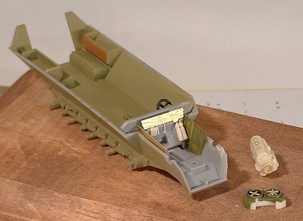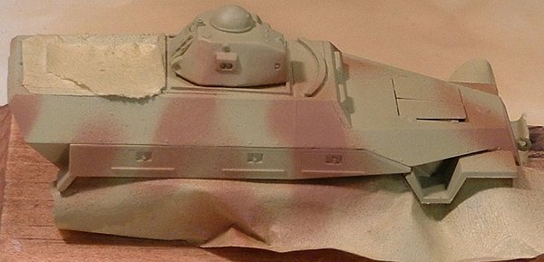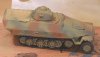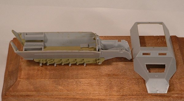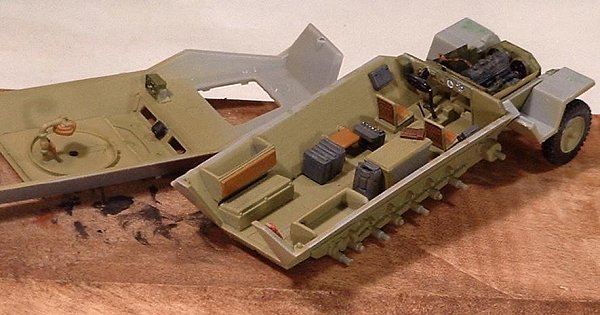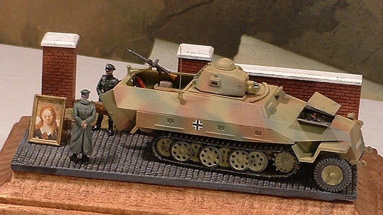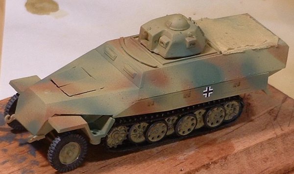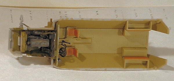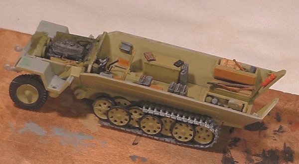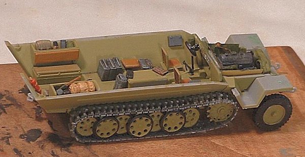 ![]() The Sd.Kfz 251 armoured halftrack (often referred to as the "Hanomag", although Hannoversche Maschinenbau-Anstalt und Eisengiesserei was only one of the firms involved in its production) was first issued to German troops in the spring of 1939 and first employed operationally in Poland. The 251 design was quite innovative, and probably deserves at least part of the credit for the success of the "Blitzkreig" strategy which served the Whermacht so well in the first half of the war. It allowed German troops to accompany the fast moving panzer columns while affording them some measure of protection. This made the halftrack superior to trucks but cheaper and faster than fully tracked personnel carriers. During the war, approximately 16,000 251s of all marks (A, B, C and D) were built, with production continuing in Czechoslovakia for some time following the end of the war. The majority of the vehicles built were model "D", comprising more than 10,500 of the total 16,000. The 251 served with panzer grenadier, reconnaissance, artillery, and specialist units on all fronts in a variety of configurations. The basic design was adaptable to wide range of functions, including anti-aircraft, engineer and communication/command. In addition to the more than 20 factory built versions, there are also a number of known field modifications, which reflect specific needs or the availability of local resources at the time. The vehicle I have chosen to model is one of those field modifications, with the turret of a Renault R35 light infantry tank mounted over the passenger compartment. The Hasagawa Sd.Kfz 251 D Hasagawa's 251 D is a very nice kit on its own. The moulding is sharp and the dimensions seem quite good. It is also, of course, the first small-scale version of this important vehicle produced in plastic. It is available in three major versions, the 251/1 armoured personnel carrier, the 251/9 heavy support vehicle (with short 75mm gun), and the 251/22 late war self-propelled anti tank gun. The build itself is quite straightforward. There is a reasonably detailed interior provided in the original kit, with an instrument panel, seats, a radio and the steering wheel mounted above the drivers seat, angled downward, as on the real vehicle. I painted the entire interior dark yellow before adding anything. After assembling the basic detail, I first added the Extratech engine compartment detail, which I will describe below. In the drivers compartment I used the Osprey Sd. Kfz book as a guide to add some more detail, mostly gear added to the side walls. To take advantage of the spring details on the back of the seats, I recommend some drybrushing - I used a gun metal silver gray after painting the frames of the seats dark yellow and the cushions reddish brown. The radio was painted olive green (according to Osprey) with the details picked out in white and black. I added three gear shift selectors (or maybe two shifts and a parking brake?) to the floor between the two seats and painted them black. The steering wheel was also painted a medium gloss black. It was at this point I realized that, with the Renault turret modification, the detail I was adding to the drivers compartment would be very difficult to see. I could choose to leave it out (which, having done most of the work already didnt appeal to me) or do a few things that would make it more visible. I chose to 1) build the vehicle with the armoured vision port open (requiring something to simulate the armoured glass inserts) and 2) open up the rear doors so a viewer could look through the back right through to the forward compartment. With that decision taken, I began adding more detail to the interior, which became a mini model in itself. With the turret, I assumed that there wouldnt be enough room inside for the forward seats. I therefore left them off, replacing them on the starboard side with the ammunition bin from the Sd. Kfz 251/9 kit and on the left with a folding jump seat, as was found in the /22 according to Osprey. I also added a few cases of ammo (from the old Fujimi Sd. Kfz 222 kit) one opened with the small shells showing. I also added a jerry can (one of the beautiful resin ones produced by Mars) beside the ammo bin and some miscellaneous gear. The two rear seats I think I added before I painted the interior. I found they are a bit thick around the storage bins in the upper part, so I thinned them a bit with an exacto. Early 251s seem to have had very nice leather covers on the passenger seats, while later in the war these were replaced with simple wooden slats to simplify production. The Hasagawa lower seats are kind of a mix of both seats. They are shaped like the early seats (sort of puffed up) but look more like the later seats, which should sort of "concave" higher at the front, low in the middle and bit higher at the back. The later ones should also show the slats. I compromised by simply scribing lines onto to the existing seats, and giving them a light wash to pick out the lines. The upper parts of the seats, the back rests, seem to have been padded in the later 251s, so I left them as is and painted them reddish brown. Finished, for the time being, with the lower hull, I super glued the resin plate over the opening in the upper half of the hull and painted it dark yellow as well. After adding the radio and a piece of kit between the two vision ports (a Prieser German mess tin), I considered what I wanted to do about the turret. The ModellTrans turret is moulded solid, with a shallow hollow area behind the hatch where you could place a figure. As such, there was no point making a hole for the turret. Instead, using a piece of plastic strip, I roughly outlined the circle where the turret would attach to the plate, so it wouldnt look quite so blank on the bottom of the mounting plate. Finally, although I have no source or historical justification for this, I assumed that there would be a hanging seat beneath the turret for the gunn