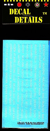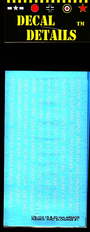 There are two small sheets in a package, each being approximately 89mm long by 47mm wide. Both sheets are identical containing the same names/slogans allowing the modeller to put them on both sides of a vehicle if needed.