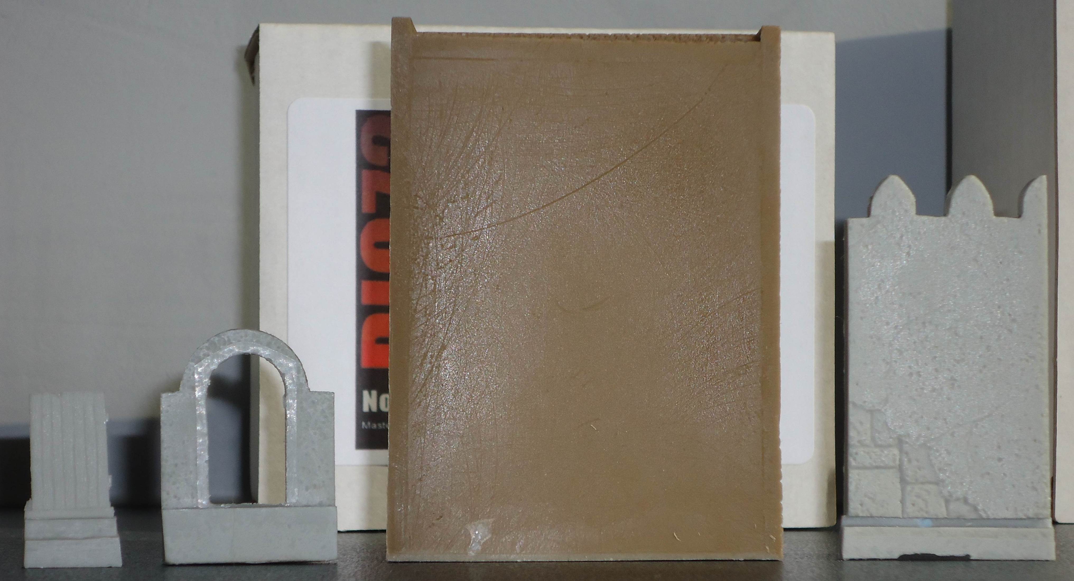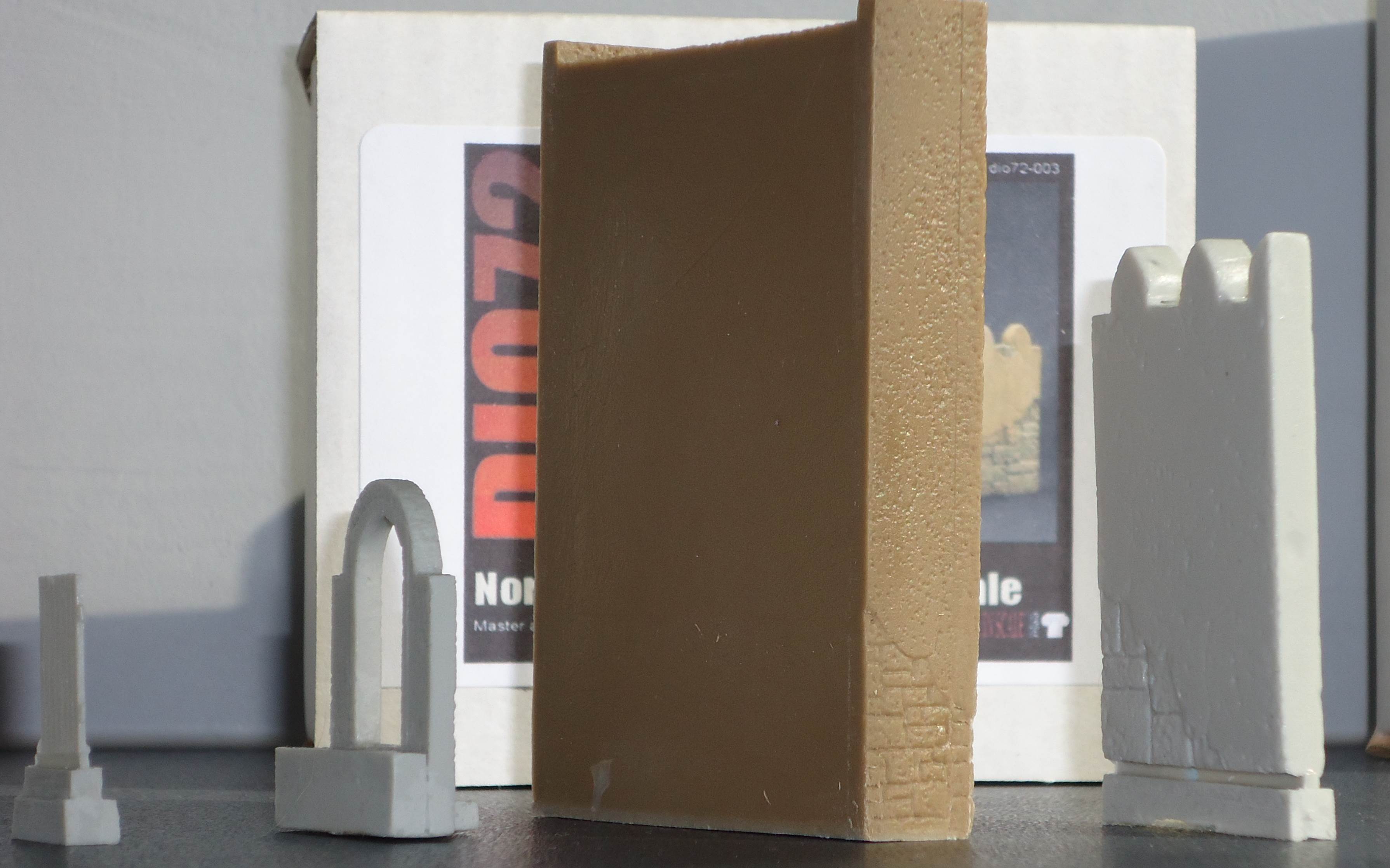 While the grey parts have detail on both sides, the brown part is solid, with a flat back. In our scale, diorama items that have detail on both sides are rather rare, with companies using open molds. Most of the time this results in a visible back-side of the walls, where the texture is rough and devoid of detail. Basically, this mean that you only get half a building and that you have to scratch the other side yourself. Dio72 has opted for another formula, where the building is solid, with a clean backside, making it ideal as a backdrop of a scene, without actually integrating the interior of the building in the scene.