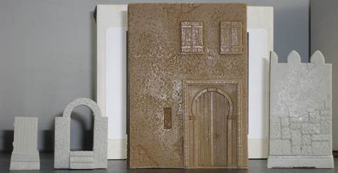 This set represents a building with a main door that has a horseshoe arch, also called the Moorish arch, originally developed by the Visigoths and later by the Umayyads. This style could be seen all over the Caliphate and adjacent areas, and was adopted by the successor Muslim emirates of the peninsula, as well as by the Almoravids, Almohads and the Nasrid Kingdom of Granada. In addition to their use across the Islamic world, horseshoe arches became popular in Western countries at the time of the Moorish Revival. (Source: Wikipedia.)