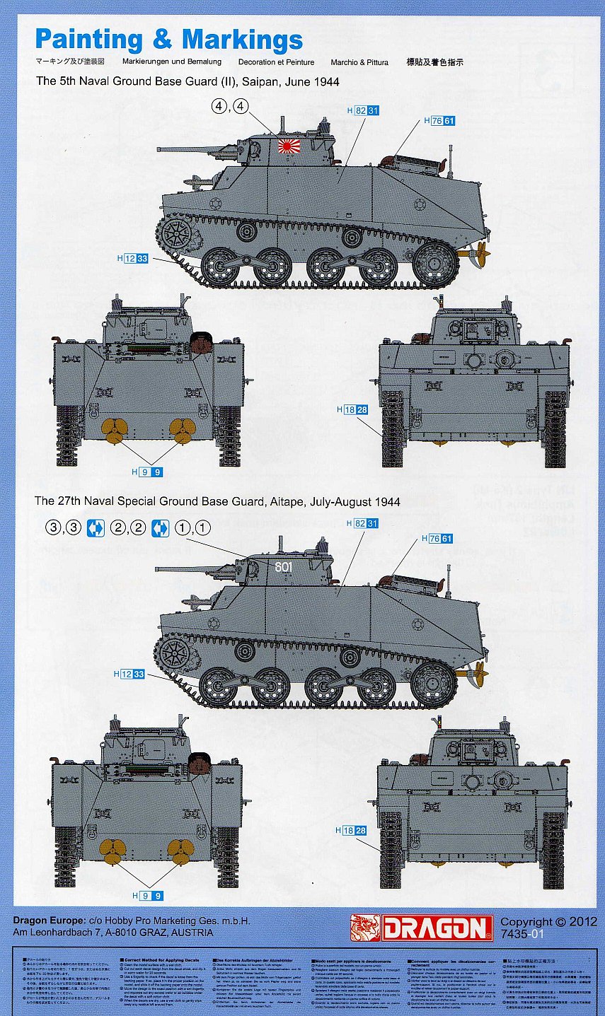 The IJN Type 2 (Ka-Mi) Amphibious tank is the first Japanese tank of this type with 184 built, all by hand. It is based on the suspension of the Ha-Go tank and could be launched from submarines and even carry torpedoes! It was mostly encountered in the Marshall Islands and Marianas, especially Guam, but they were usually dug-in. There is a surviving example with full pontoons at Kubinka, Moscow and a hull in the bush near an airport on the Island of Palau. [1] On the box top we have the Ka-Mi in an aggressive mode, belching black smoke with another Ka-Mi behind. In the background is a grouping of Japanese troops. The artist of the box-top artwork can't be found. The box states there are around 45 pieces. Upon opening the box, we can see it's mostly full of air. The kit only comprises one sprue, hull top and bottom and header card with tracks, small sheet of decals and one tiny photo-etch square of screen taped to the card in typical Dragon fashion. This is a small kit, the top hull only measuring roughly 2 3/4 inches long. A lot of empty space in the box should be expected this time. The instructions show the kit being assembled in four very largely printed steps that could be compressed into three as as the fourth step is only adding tracks and the assembled turret. You can have your Ka-Mi tank in any color; as long it is dark grey. Two marking schemes are provided. One on Saipan in '44 with the rising sun flag on the turret, and "601" from Aitape, July-August 1944. While taking the parts out of the baggies for photographing, I played with the fit of the upper and lower hull halves. They seem to have a snap-tight fitting, but without pushing hard I noticed you may end up with the sponson pieces peeking out underneath the hull. Attention will be needed here. I also took note as you will, of the strange attention to detail when it's not needed and a lack of detail where it certainly could be used. Two beautiful machine guns with ammo mags popped out at me, but the hull machine gun location hole is not even drilled out to receive it. With the top turret hatch open maybe the idea was the other machine gun would be visible, but Dragon did not make a breech for the main gun, which would also be visible. This will be a great weekend builder or even quicker. A Ka-Mi with full pontoons is expected soon, and should help fill the otherwise nearly empty box. References: Review sample purchased by the author. |