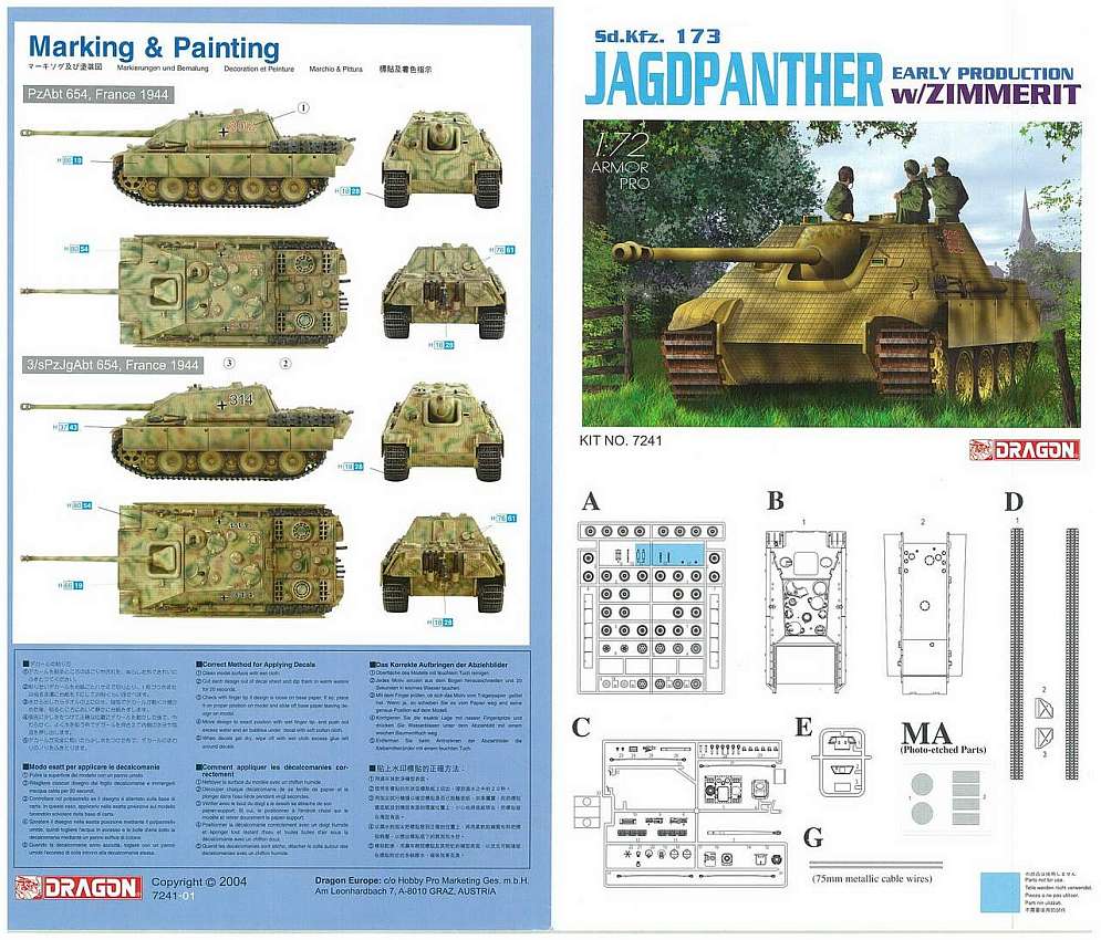 The soft black vinyl moulding comprises not only the tracks but also the rear bins, so they have the zimmerit also on the sides. There is also a PE engine mesh set and two metallic wire towing cables. The kit derives from the former die-cast hull Dragon production, as visible by the hull fits and the two little screws provided. The kit nicely contains also the parts needed to make a late Jagdpanther plus a second set of sprocket wheels. Obviously with the “zimmerited” surfaces, only the early version can be built, but with some more choices possible. The model depicts a June-September MIAG production vehicle having the three points pilzen crane on the roof. The single piece barrel proposed was used until October 1944, but already from May 1944 the two piece barrel was also used and this possibly is in the kit too. The multiple exhausts are correct for the batches produced after May 1944. However, the way they are moulded gives us the possibility to cut away the two little pipes on the left one, leaving just a single pipe (like the right one) as in the former batches. A real good hint for a diorama is the engine with the engine deck and its central hatch as separate parts. A good information source on the net is panther1944.de. |