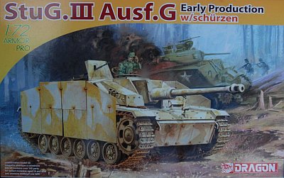 Recently I have been working on a Trumpeter Stug III(B) kit which I am backdating to an (A). It is also a good kit with good exterior detail. However, compared to the Dragon kit it is over-simplified and toy like. The Dragon kit comes with many options, spare parts, photo-etch parts and some excellent decals. The kit can be built with the hatches opened or closed as separate parts are provided. The hatches have interior and exterior detail and if the commander's cupola is modeled closed you can still have the scissor scope poking through its small hatch at the front of the closed round hatch. The extra hatches could also be used to detail your Trumpeter Stugs after you use your carving skills to remove the molded closed hatches. The kit comes with two options for the engine intake vents. They can be modeled open using the very nice PE engine screens or you can model them closed with the alternate pieces. The kit also has the extra 105mm gun if you wish to make that version or you can use it on another project (Trumpeter conversion maybe?). The detail on the wheels and running gear is excellent some of the best I have seen in 1/72. Some of the tools are molded on to the fenders (shovel/axe/towing hooks) and this is a drawback to the over-all quality of the kit. The rest of the tools are moulded as separate parts. The kit comes with the early local defense machinegun and shield. I was a little disappointed the shield not being PE but I am being greedy. The machinegun and shield are very detailed. The schürzen are also a little bit of a disappointment as each side is molded as a solid piece of plastic. It would have been better as PE parts or at least separate pieces. The rails and schürzen holders are plastic but very thin and delicate. The box contains very many finely detailed parts and I am sure that with minimal effort it will build into a nicely detailed and complex model. The markings included in the box are excellent and offer four options. This Dragon Stug III G simply blows away the Trumpeter Stug III G kit and in the US the Dragon kit retails for about $5 less than the Trumpeter (Although I have been picking up Trumpeter kits on eBay for $6-8). |