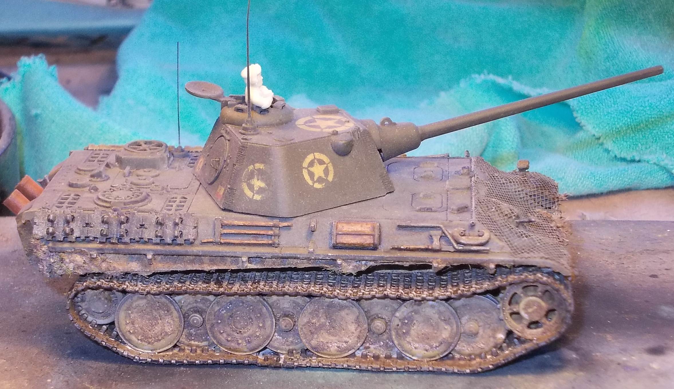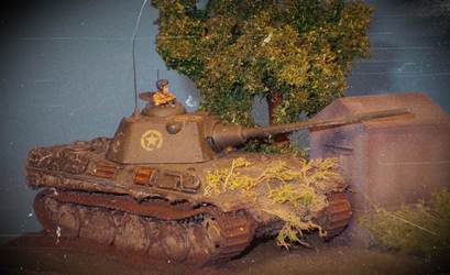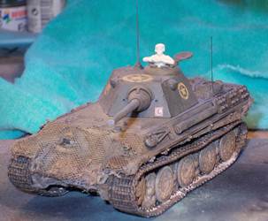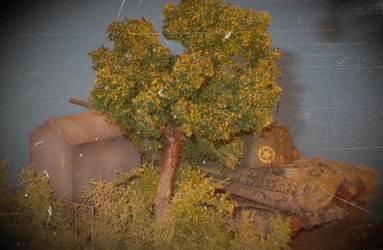 fatigue ? I could go on rambling about some other minor shortcomings of the kit, but I believe I have made myself clear by now. The kit is not a complete disaster, assuming it won't disintegrate in a couple of months, but it is typical of a new brand's first efforts, as it was at the time of this release. I am pretty sure the newer Panther kits from Dragon will be infinitely better (and more expensive). I didn't try the kit decals, as I decided to go for a "what-if" paint-job. The figure in the picture is from Milicast set n°5 (yet to painted), the stars are spray-painted using Stencilit and the decals are from Peddinghaus. In the picture aboven the tracks still need to be integrated with the dio I am preparing (which will help hide the gap). I added "chicken wire" to the front glacis to hide the ill-fitting hull. Foliage still needs to be added; dried plants will beu sed for this. The diorama