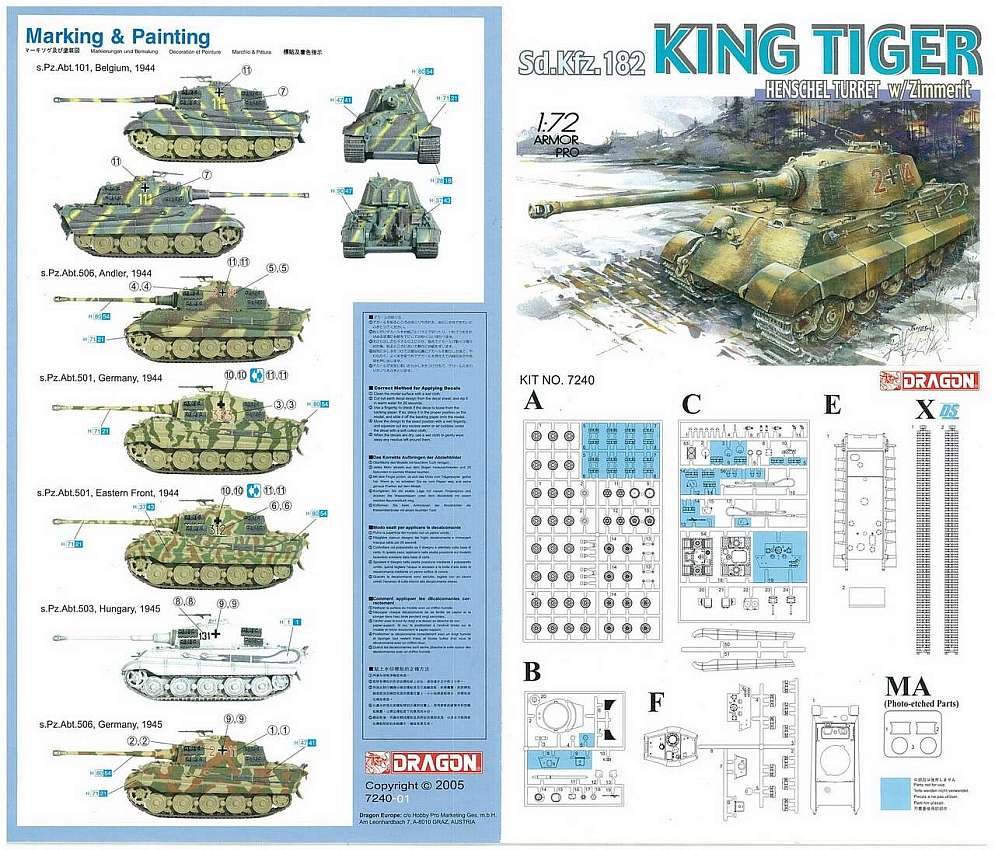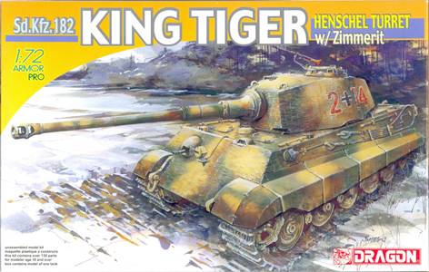 | This kit is a modified release of the earlier King Tiger with Henschel Turret (kit 7246) by Dragon. (Never mind that the earlier kit has a higher kit number.) The main difference is the replacement of some parts by Zimmerited equivalents and the introduction of DS tracks. The upper hull is very similar to that
