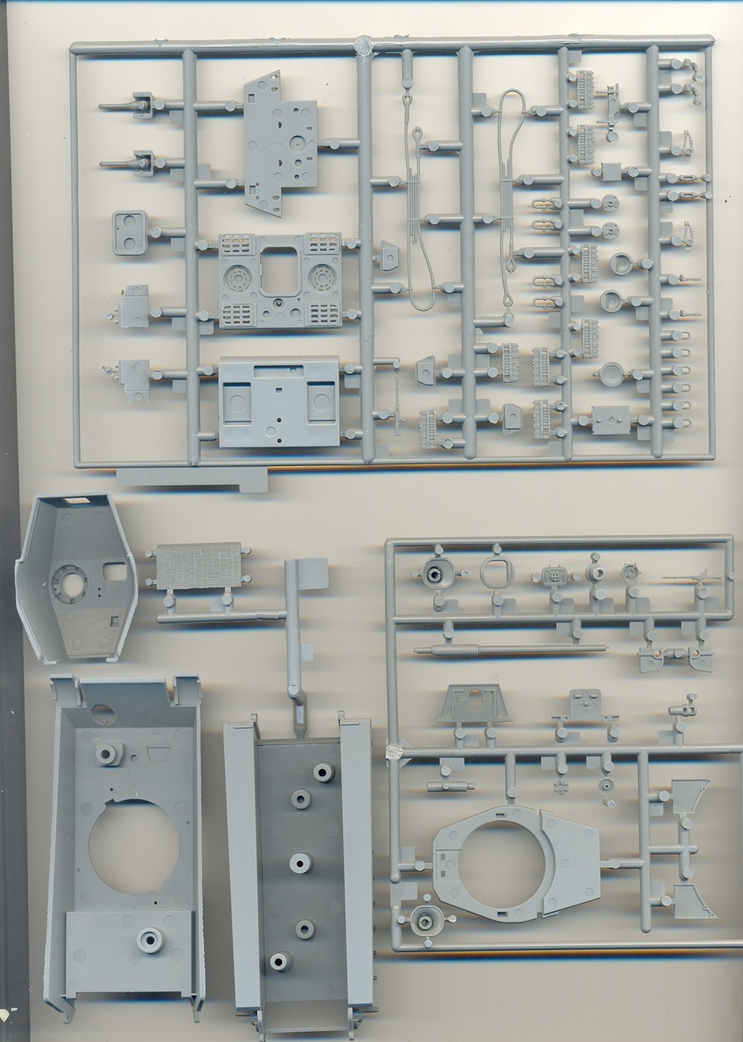 are specific to the Zimmerited kit: The fenders ought to have been the same as in kit 7246, but are not. In my kit they were clearly marked "JAGD", and are too long. Obviously someone put the parts of the Jagdtiger kit into this box. (The fenders in kit 7246 that Doug Chaltry reviewed were marked "KING".) Well, it's better than the other way around and it's not that difficult, I guess, to cut off a centimeter or so from the last section of the fenders. The PE fret is obviously the same as in kit 7246, as it is marked as such. It's very nicely done.