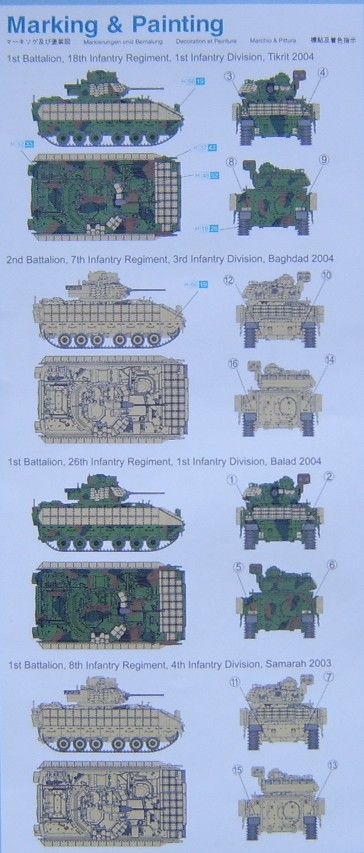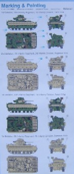 The Fourth release in the Dragon Bradley series and the one that I have been waiting for the longest. So what do we get?? all four Bradley's share the same hull (bottom and top) the first two sprues, the wheels and to some degree the tracks but more about that later. The M2A2 with ERA is currently in operation in Iraq and there are plenty of pictures on the net to help when making this kit.The Dragon Bradley's are later versions of this vehicle than the Revell kit, with the Dragon kits having the newer tracks and the fluted barrel for the gun, there is also a slightly different layout for the turret armour, the Revell kit would be alright for a period of up to and including Desert Storm in 1990 and shortly thereafter, the Dragon kits range from the Modifications since Desert Storm up until present day The Hull has a similar breakdown as the Revell Bradley, with the exception that the Dragon lower hull is a single piece with suspension arms moulded in place. Although Dragon go on about slide moulding, it is in fact nothing new and has been around for years, but all credit to dragon for now taking it to new heights and using it in ways not thought of before. The upper hull is similar to the Revell hull with notable exceptions, mainly the great big screw hole in the front plate. However there are other more subtle differences, noticeable amongst these is the open drivers hatch, the radiator covers next to the driver show the correct mesh pattern and the exhaust louvers have the actual exhaust missing (it is included in the kit though) The rear troop hatch is separate with the option of the M2 or the M3 hatches to fit. The two main sprues, which are common to all kits, contains most of the parts to be fitted, including two gun barrels, one fluted and one not, which although a little fat can be used to replace the Revell barrel with the incorrect muzzle brake. Also on these sprues are the two side plates and the front plate(which hides the screw hole) plus all the other add on armour and parts for the turret. In the M2A2 with ERA and the 2004 version, there is an extra sprue that contain the parts to bring the Bradley up to date with the latest modifications, these include new front armour plate which doesn't have the old redundant fittings for the swim barrier, new lower hull frontal armour of a single plate instead of the two plates on earlier models, a new drivers hatch and attachment for the latest version are included as are the two rubberized holders for the side armour.Also included is a new lower turret half with the new 7.62mm ammunition box holders around the rear turret bin The M2A2 and the 2004 versions include a new turret top with the new flatter gunners hatch, the add on armour and gun mountings are included on the first two sprues, One of the problems with the kit lies with the turret, well not so much the turret but the gun mantlet armour, As with all Bradley kits including our bigger brethren in 1/35th scale, all manufacturers have cast the mantlet armour as a single piece, whereas in fact it is made of three pieces with only a very small section elevating with the gun as can be seen below, although it is not totally correct as the lower portion should move as well. The ERA is provided in seven pieces, four of which are for the turret, the mounting brackets for the turret ERA are provided as PE parts, Although the Era has all the nuts and bolts in position they are slightly heavy but other than filing them all of and replacing every single one with something smaller and thinner, you will have to live with it, however that said once painted they are not so noticeable. The wheel sprue has all the wheels and return rollers, it also includes the later type sprockets, My only moan about the wheels is the fact that you have to insert a rubber grommet inside the wheels, these then push on to the lower hull, this makes for a somewhat loose fitting, with the DS styrene you can use normal cement to help, but with the old vinyl type super glue must be used although not always with the best results. The PE fret has all the mounting points for the Turret ERA, plus the latch for the armoured cover on the tow launcher and a new drivers hatch latch ! The tracks in the ERA version are made from DS styrene, these are certainly and improvement over the original vinyl type, both are the same and nicely detailed and have the "big foot" pads. To get a good fit with the DS tracks you could do with cutting 1 link out, this makes a nice snug fit without pulling on the suspension, this can be done easily with the DS styrene which can be glued back together with a simple butt joint and still be strong enough to pull round the wheels. Markings are provided for 4 vehicles in Iraq The kit measures out to 1/72nd scale, with the exception of the wheels I really like these kits especially with the DS styrene tracks. References: M2A2 M3A2 Bradley by Walter Boehm and Peter Siebert Concord mini color series 7506 M2 M3 Bradley in Action by Jim Mesko Squadron/Signal Publications M2/M3 Bradley Verlinden Warmachines No5 Jane's Armour and Artillery 1990-91 11th Edition by Christopher F Foss Jane's Tanks and Combat Vehicles Recognition guide Second Edition by Christopher F Foss |