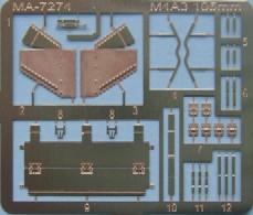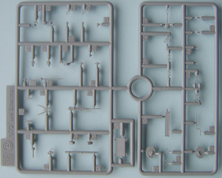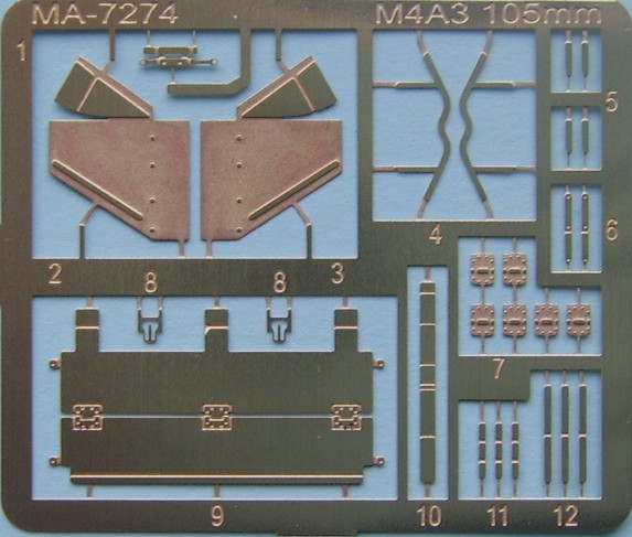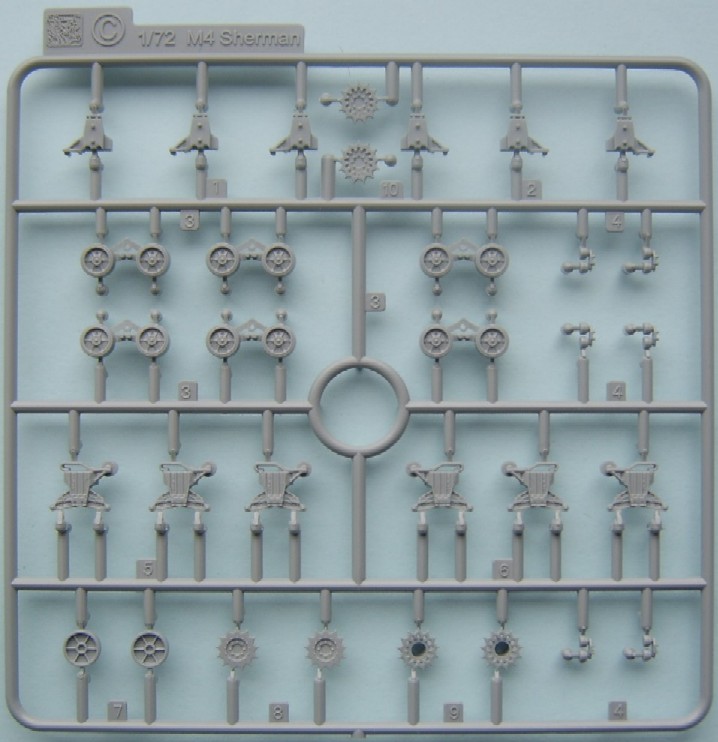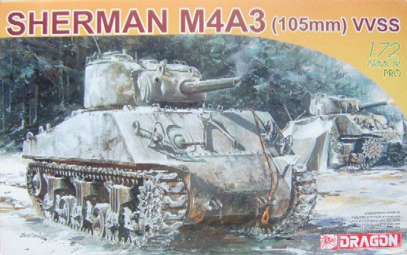 Yet another Sherman Release from Dragon, this time the 105mm version using the early VVSS suspension. This is actually the third release in 1/72nd scale of this vehicle, the other two releases being from Eduard and Hät. So how does this release measure up to the other two releases ? Obviously it is better detailed than the Hät kit with each being designed for opposite ends of the market, Hät also has the problem of being slightly too long in the hull rear. The Eduard kit has good detail, separate tools but is too short in the hull. Of course it has been well mentioned that the gun mantlet is too small which has been made out to be a heinous crime, but what of the other two that nobody has mentioned, we shall see ! The kit hull is exactly the same as the earlier M4A3 with all the same fittings for the hull and suspension The new sprue is for the turret and the dreaded mantlet, but how bad is it?? Given that the mantlet is 1033mm wide and that the measurement wasn't messed up when measuring or when enlarging the originals then the mantlet should be 14.333333 wide, the three measure as such Hät = 14.8mm Dragon = 13.6mm Eduard = 13.1mm So the Hät one is the closest but too large, the Dragon one is 0.7mm too short but looks the best and the Eduard is even smaller and probably the worst detailed of the 3, with the release of the UM M4 105mm HVSS we shouldn't have long to wait to see what theirs is like and how it measures to the other 3. For those that want to be exact and feel that this site should be more about Shermans and seem critical because I haven't got the Hunnicut book, good news it is to be re-released so you can go and buy your own. The extra turret ventilator is supplied as a separate part, the commander has the later all round vision cupola. One item missed in the Eduard kit, was that the MG has a different mount so it clears the extra ventilator, Dragon have included this mount. The rest of the kit is the same as the M4A3 with the exception of the rear exhaust grill included from an M4A1 or what I presume will be the M4A1 (76)W and the early M4A1 has a PE grill. The PE set is the same as provided in the M4A3 (76)W kit