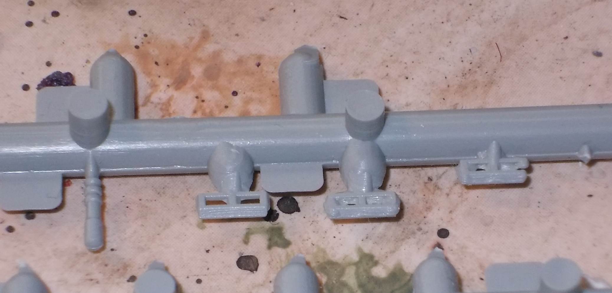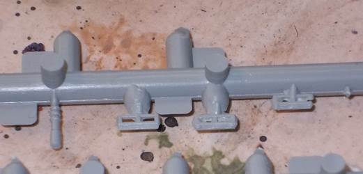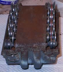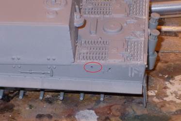 In general, detail is rather soft, heavy and minimal. Notable examples are the track hangers (?) on the side of the hull, which I didn't install. If these were to scale, they could be used to suspend a complete Tiger, not just some tracks. There is a hole in the side of the hull (left side, to the rear) that seems spurious to me, as nothing needs to be fitted there. Conversely, there are no locating holes for the jack. The sheet covers for the exhaust are in brass. They fit rather badly and are handed. The manual would lead me to believe that left and right side are the same, which they aren't. The tracks