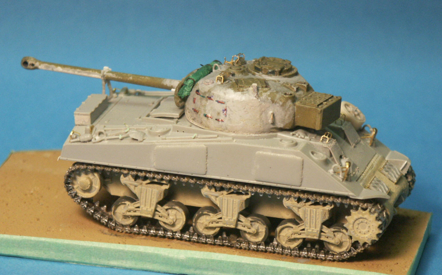 A light tan paint was sprayed over the base and up onto the lower hull, after which I attached browned static grass to the base with white glue to represent a dry late summer field in Italy. Looking at the vertical volute spring suspension (VVSS) bogies makes me think how the detail of the bogies are so often ignored during assembly and reviews, I have done it too. We'll make sure there are exactly 24 bolts around a certain roadwheel and that the kit is exactly 1/72 scale, but it seems like Sherman bogies are just ignored in resignation. For example, take these DML VVSS bogies here, the nice looking stamped type roadwheels are moulded rigid onto the rocker arms and on all the wheels the grease plugs are located in the same orientation of about 12 o'clock. The bracket holding the return roller appears to be an intermediate style with a straight bracket and no raised roller, but the bracket looks significantly too short in the horizontal direction. The bogies just look too big in relation to the size of the sprocket wheel.