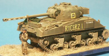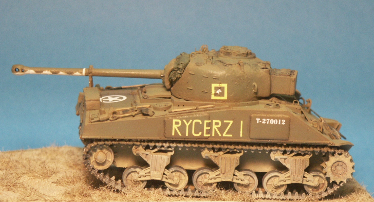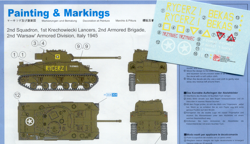 A LITTLE HISTORY FOR THE MODELLER I will not cover much about the history of the Firefly or the M4 Sherman tank here, being covered well in many other books and articles, but I will discuss a little on their service with the Polish Forces. During the Second World War the British supplied both Sherman and Sherman Firefly tanks to the Polish armoured forces serving in Italy and in NW Europe. (It should be obvious that none served with Polish Forces fighting under the Soviets in Eastern Europe.) After conversion from a Sherman Mk I or Mk V to a Sherman Firefly Mk Ic or Vc, they were accepted by the Polish units with the same major modifications as used by UK and Czech Firefly tanks. Field modifications to the tanks at the unit level were also evident. The Polish Firefly Ic RYCERZ I T-270012 is modelled here as it is very well documented in photos and I have available two 1/72-scale models that include the needed decal markings. RYCERZ I is Polish for Knight 1, a tank belonging to the 2nd Squadron, 1st Krechowiecki Lancers of the Polish 2nd Armoured Division that served in Italy. Regarding Sherman terminology, many unofficial terms have been common with the M4 Medium, such as low-bustle turret, high-bustle turret and fancy sprocket. Many of these actually have part numbers such as the D50878 turret. For my reviews I will continue to use the unofficial common names. |