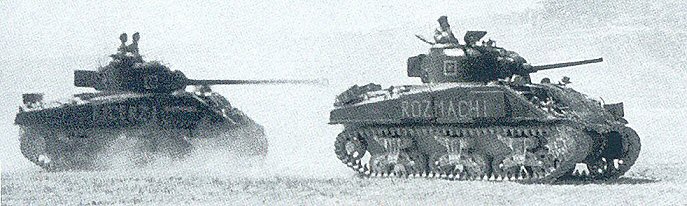 (M4A2) ROZMACHI to the right. • I see no indication of an appliqué armour plate on the turret, but the photo is not clear enough to me to be sure. However, this picture offers a better view of the rectangular storage box mounted on the engine deck. • The Sherman III at right, ROZMACHI, also appears to have a camouflage net or matting on the glacis thereby obscuring much of the fittings on the glacis. |