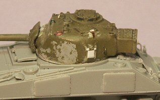 were glued onto the turret side to represent lashing points for gear. Notice that the pistol port hatch has been sanded down and the area re-textured with Mr. Surfacer. Except for the commander’s cupola, the features of this turret match the one included within the DML Firefly Ic kit in having no pistol port but having the cast-in cheek armour. |