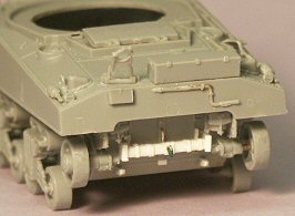 | On the rear engine compartment there is a small brass wire handle for the double doors and below that is a scratchbuilt “British-style leaf spring towing hook” as found in my reference book. I’ve read that the British preferred this style of rear towing fixture so their M4s were delivered to the UK with no factory installed tow pintle. These details of the rear of the tank are often not visible in historical photos due to shadow. Additionally, this feature appears to be missing from museum displays, so it was a challenge to find what they looked like, so as to replicate with styrene. | ||||