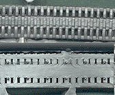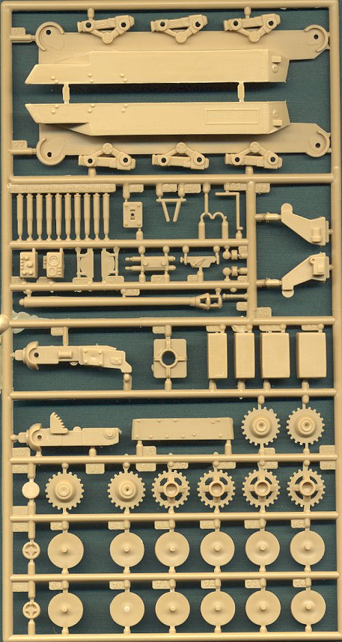 The real drawbacks to the kit are the wheels and tracks. As was typical of many of ESCI's models, the wheels were molded as single, double-wide wheels, instead of the pair of very slim wheels that they should have represented. Considering the high visibility of the wheels after construction is complete, this oversight is very apparent on the finished model, and looks quite poor. The tracks are horrible, of course, unless you buy the ESCI/Ertl version of the kit, which includes hard styrene link and length track, but even these are only mediocre, because the inner surface is bare to accomodate the solid wheel pairs.
