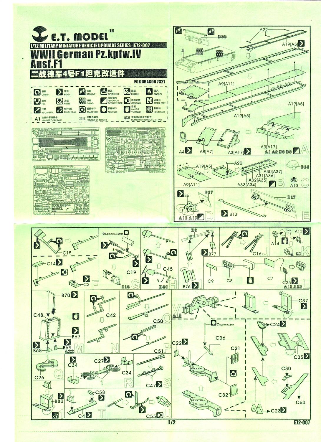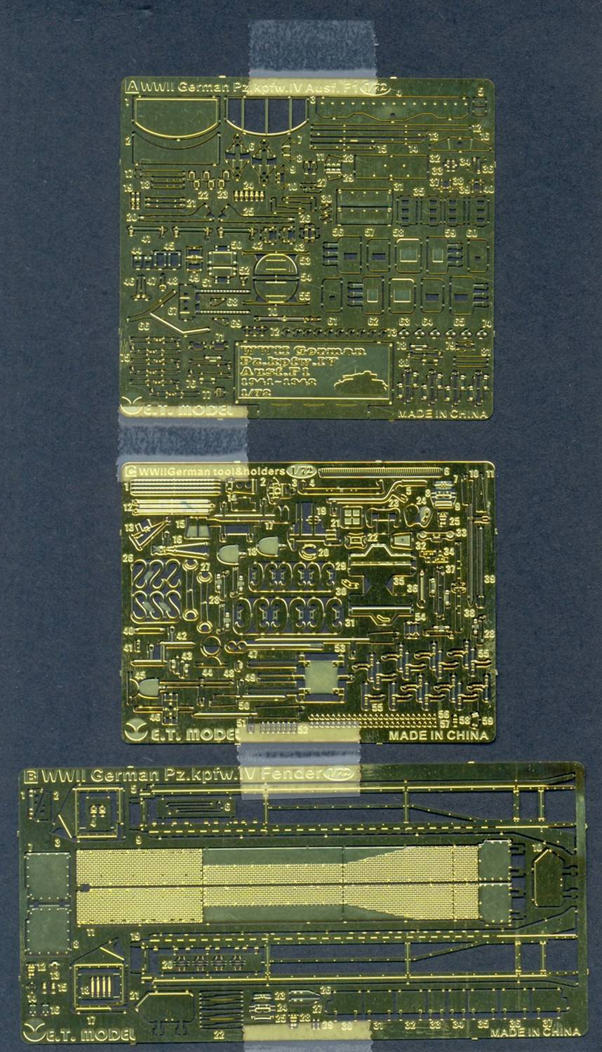 When I opened the envelope containing this set (and its sister set) I was awestruck at the quantity and crispness of the details that are present on the three photo-etch sprues (two of which are shared with E72-014). "One step beyond" went through my mind and perhaps the name of the ska band that made that phrase world-famous might be quite appropriate here as well. This set is meant for Dragon's Panzer IV Ausf. F1 (kit 7321). A very fine kit in its own right which comes with its own minute amount of PE. So what do we get ? - Complete fenders, with frame and