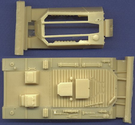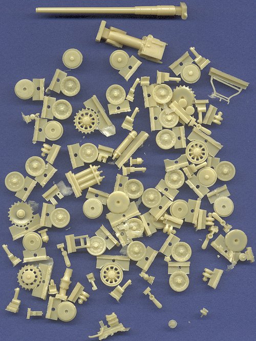 ![]() The official name of this vehicle is 12.8 cm K40 /61 auf PzSfl V, which is quite a mouthful, so I'll continue to refer to it by its nickname "Sturer Emil". Euromodel Plus is the latest in the ever increasing numbers of European resin model makers. They are located in Poland, and this kit bears a striking resemblence to the models produced by ARMO, so I suspect that the same master model makers are being used by this company as well. That's a good thing, because I have always been a big fan of the ARMO kits. The kit is primarily resin with a small fret of ten photoetched brass pieces. Here are scans of all the resin bits: I am very impressed by the overall quality of this kit. The master parts are sculpted with great precision and detail, and the molding is also very well accomplished. The majority of the parts are related to the complex chassis, but thankfully the instructions are detailed enough to clarify its construction. The tracks are very nicely detailed, and will require the "heat and bend" technique for their installation. Interior detail is composed mainly of the giant cannon, with most of the interior details molded onto the insides of the superstructure walls:
