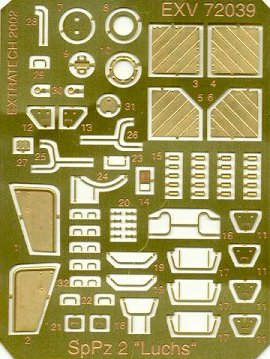 A fairly small set this time, most of the parts are very tiny latches and handles. The headlight guards will be very welcome, as well as the thin fenders. This is typical Extratech quality: replacing only those items that need replacing. Again, it's not as extensive as some other brass sets, but it is very inexpensive. It is also the only set currently available for the Revell Luchs.