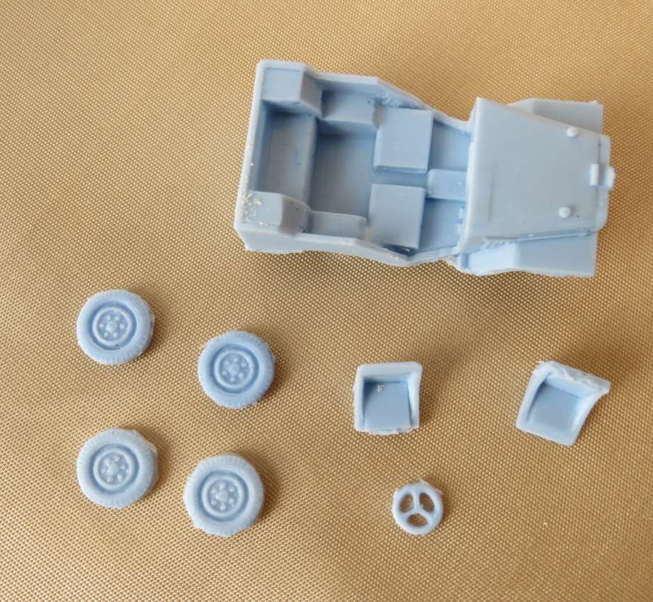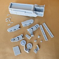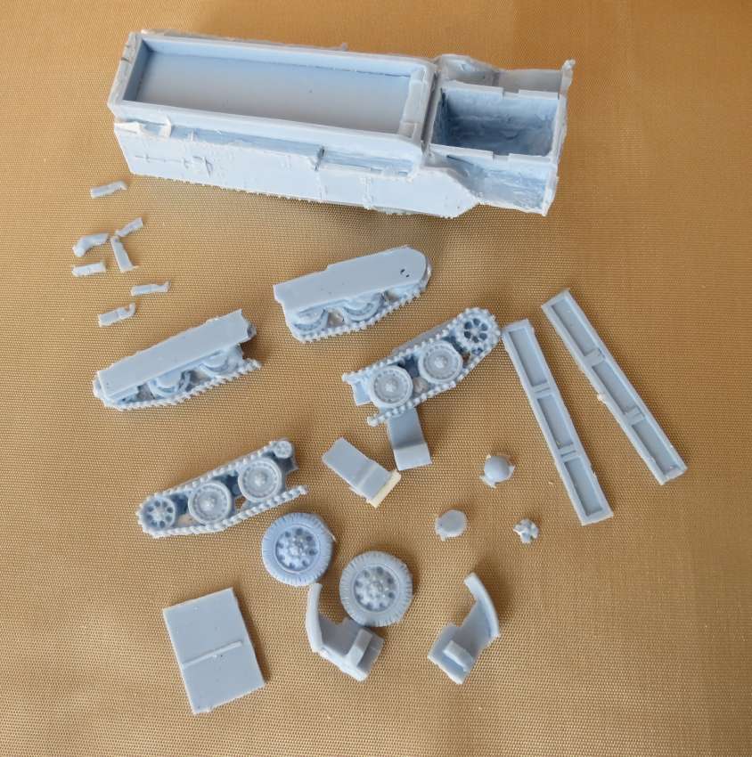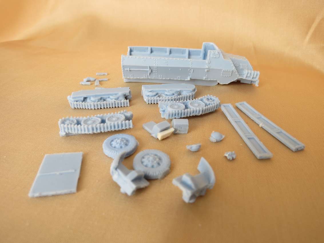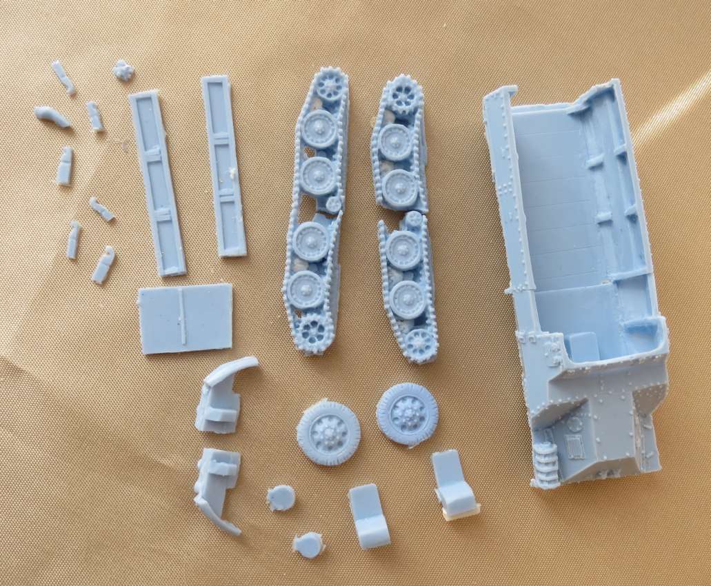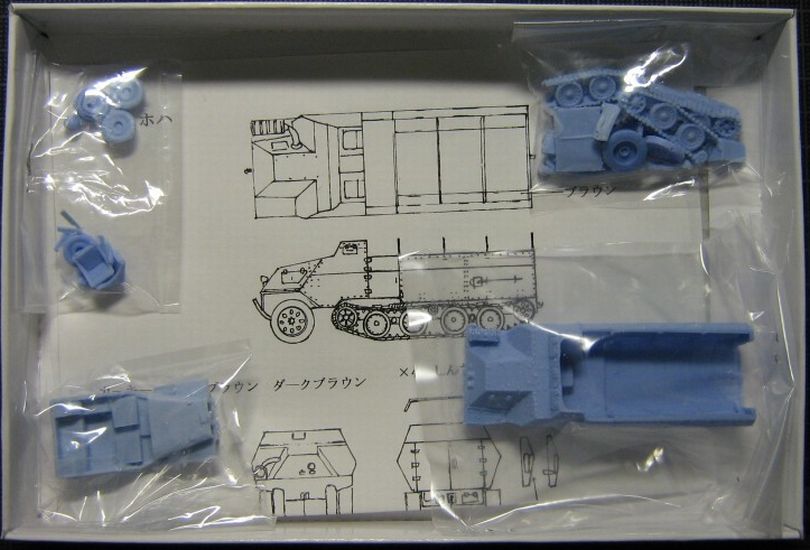 The two kits come in a carton box measuring 21.5cm x 8.5cm x 3cm. Parts are separate packed in separate plastic bags. The half-track has 23 parts while the AK10 has 8. All parts are cast in light blue resin.