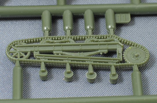 The number of attachments points has bedevilled me also in another area. The two suspension parts (tracks and wheels are moulded together) has 10 big ones to clean up. Additionally, these are all situated on the outer side of each track, meaning removing them is made more difficult because it will have to be done between the tread pattern. Another problem here is the prominent seam line running all along the tracks. I didn't remove these on my model to prove my case (see below). |