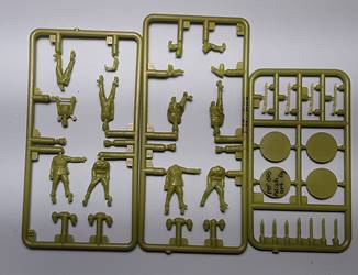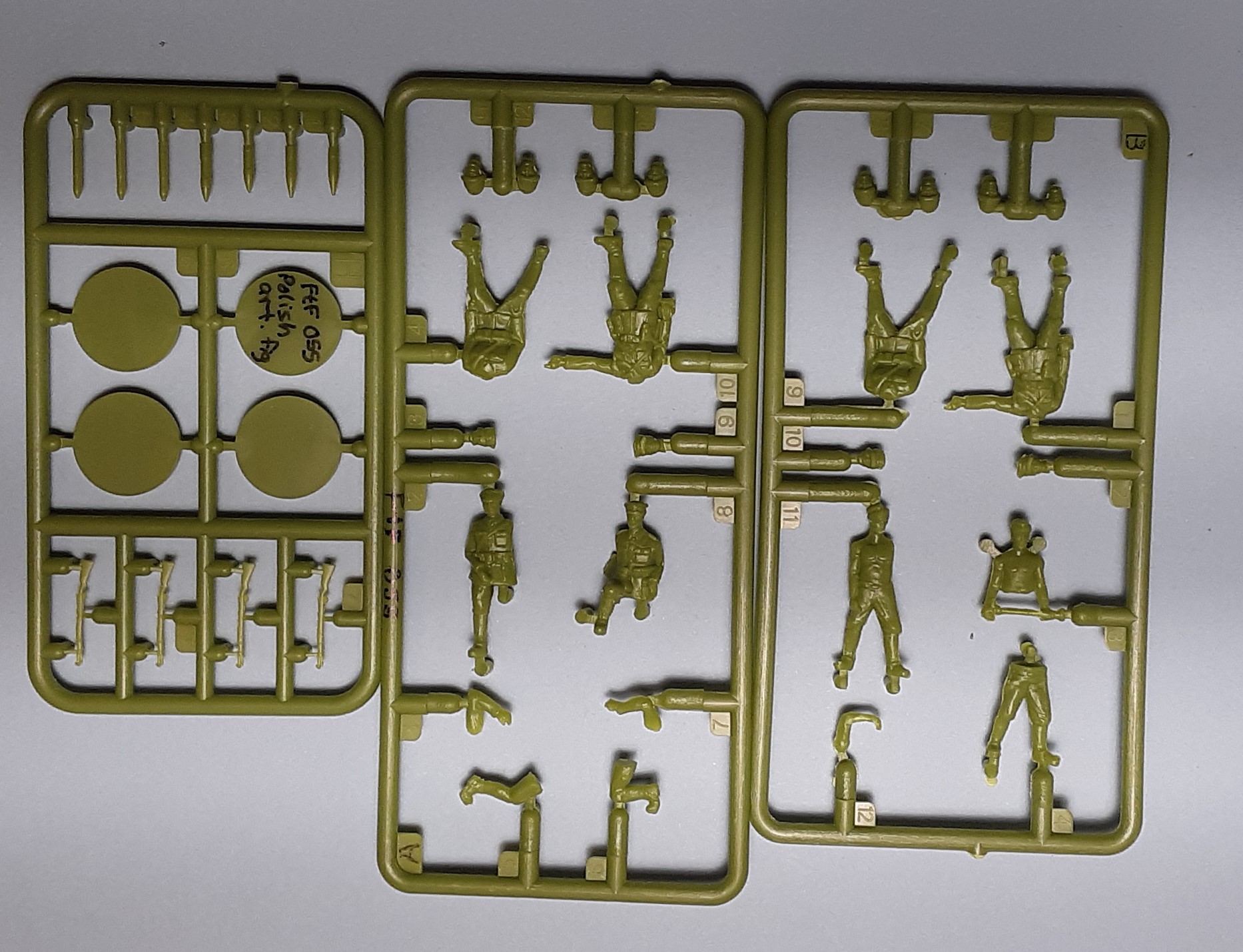 There are also two smaller sprues holding disc bases for the figures, 75-mm and 100-mm artillery shells, and wz.29 or wz.98 rifles (which are based on the German Mauser K98 rifle). The rifles are well rendered, better than many in this scale, but the 1/72-scale Dragon and Preiser K98 rifles are a little better proportioned and detailed. |